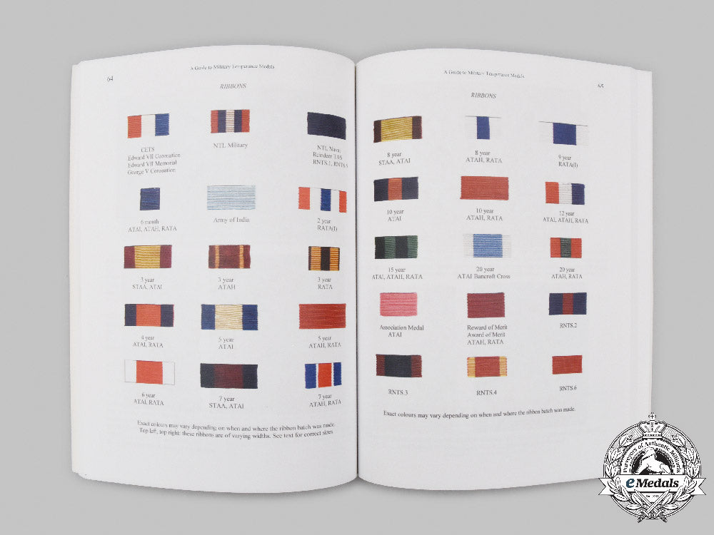 Softcover, perfect-bound, the laminated front and back cover with photographs, entitled "A Guide to Military Temperance Medals (Second Edition)", by David A. Harris, the First Edition originally copyrighted by the author in 2001, this Second Edition copyrighted by him in 2006, the original First Edition produced to celebrate the Diamond Jubilee of the Orders and Medals Research Society (OMRS) 1942-2002, printed and bound by Stewart Publishing. The book documents the medals, trophies, fobs, pins, rings, badges, etc. issued by the various Temperance Associations, in both the United Kingdom and India. Each item states the metal content, the overall description of the item, its size, maker's marks (if applicable), its date of issue, with some items highlighted with a brief history. It begins with a Foreword by the author, followed by an article entitled "Temperance and the Armed Forces" (detailing the history of the temperance movement in the Armed Forces). The book is divided into twenty chapters: 1. ATA (Army Temperance Association) and RATA (Royal Army Temperance Association) Trophies; 2. Church of England Temperance Society (CETS); 3. Independent Order of Good Templars (IOGT); 4. National Temperance League, Army and Navy (NTL); 5. Royal Naval Temperance Society (RNTS); 6. The Soldiers' Total Abstinence Association (STAA); 7. Army Temperance Association India (ATAI); 8. Army Temperance Association Home Organisation (ATAH); 9. Royal Army Temperance Association India/Home (RATA); 10. Army Badges, and Campaign and related Bars; 11. Indian Army Temperance Association (IATA); 12. ATA and RATA fobs, pins, rings and badges; 13. RATA Physical Efficiency Awards; 14. Pledges and Soldiers of the Temperance Movement; 15. Religious Temperance Medals; 16. Regimental Temperance Medals; 17. Sports and Shooting Medals; 18. Makers' marks and hallmarks; 19. Crowns; 20. Photo section. It concludes with six Appendices and a Bibliography. The book contains 128 pages, with 124 of those pages with descriptive text and complemented by multiple black and white photographs of the various medals and awards throughout, printed in black ink, plus four pages (63-66) of colour plates placed in the centre of the book, the middle pair of pages illustrating various medal ribbons, printed in four-colour inks, all on a white paper stock, measuring 184 mm (w) x 240 mm (h) x 8.5 mm (d), the book accompanied by an insert sheet listing eleven corrections to the Second Edition. It exhibits scuffing along with creasing and curling on the front cover, however, the pages within remain pristine. Better than very fine.