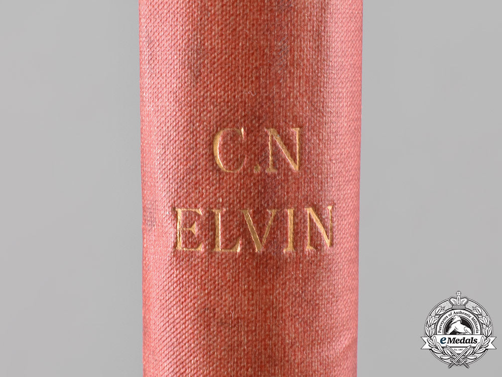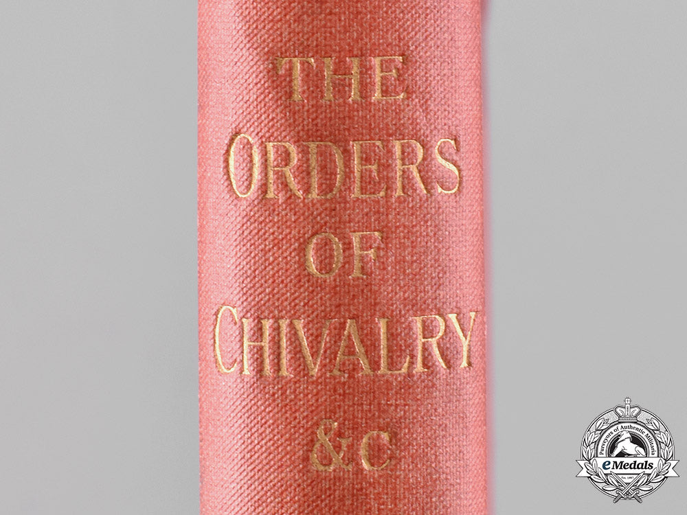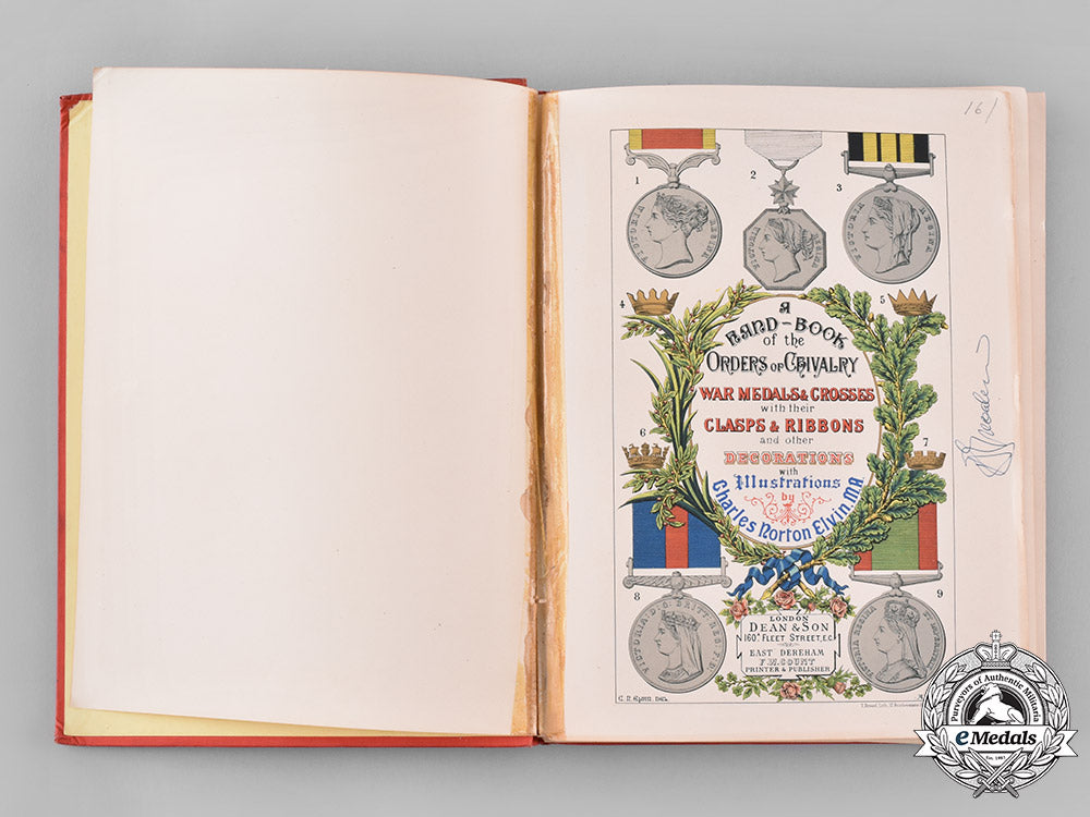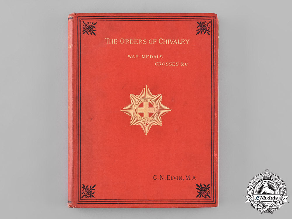 A Hand-Book of the Orders of Chivalry, War Medals & Crosses with their Clasps & Ribbons and other Decorations, with Illustrations, by Charles Norton Elvin, published in London in 1892 by Dean & Son, red cloth hardcover with gilt decoration, with a chromolithographed title-page, unpaginated, with 30 plates, almost all chromolithographed, measuring 19 cm (w) x 25.4 cm (h), presenting many loose pages and mild soiling, and in overall good condition.