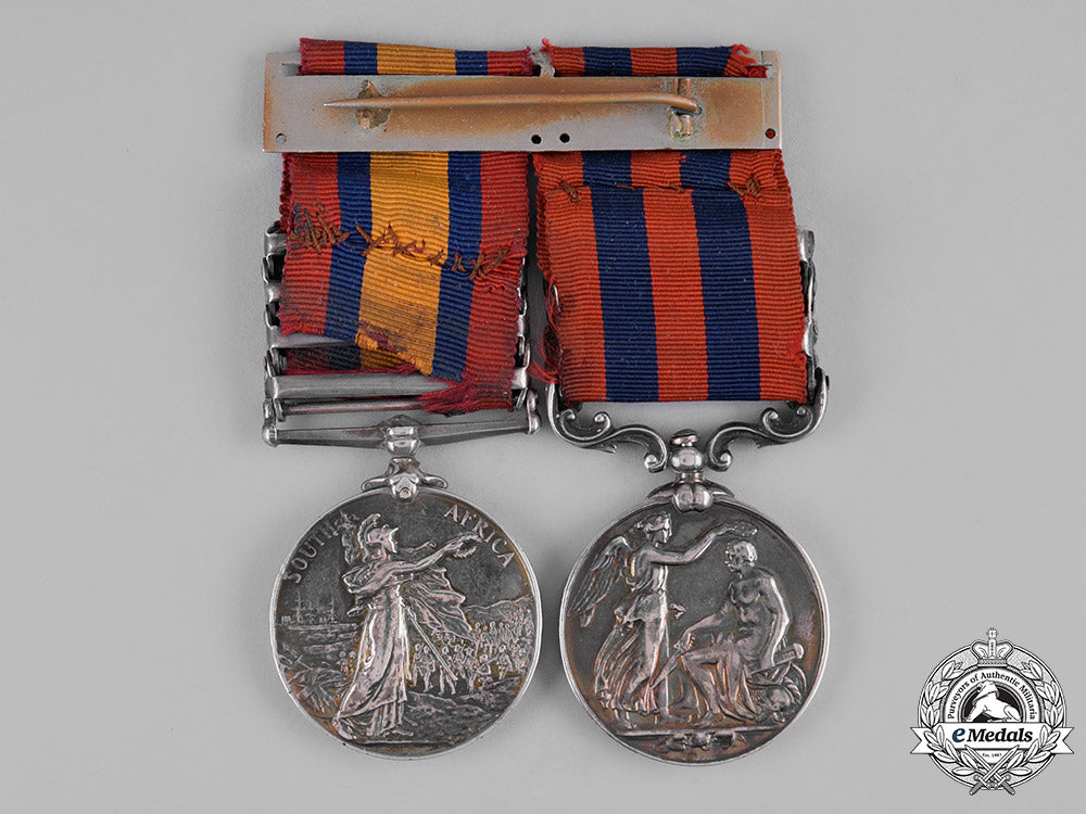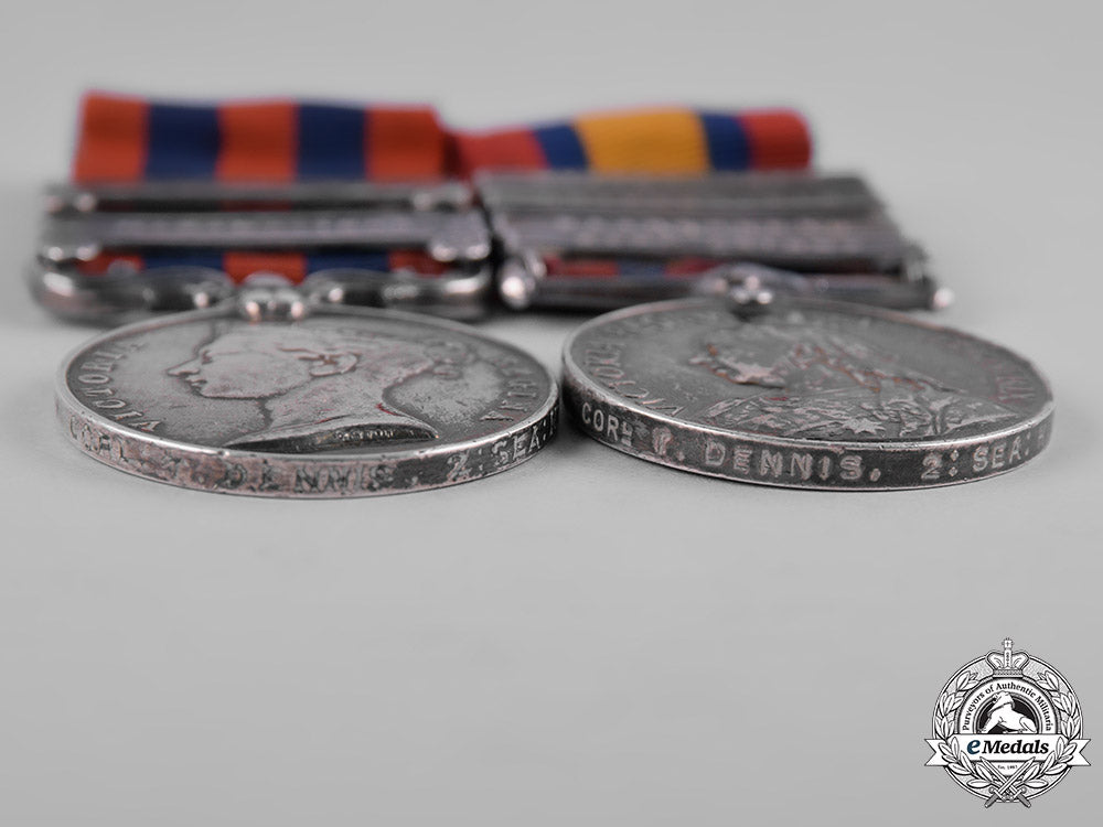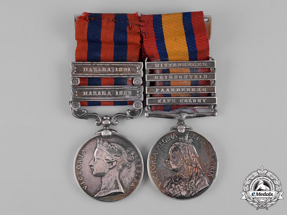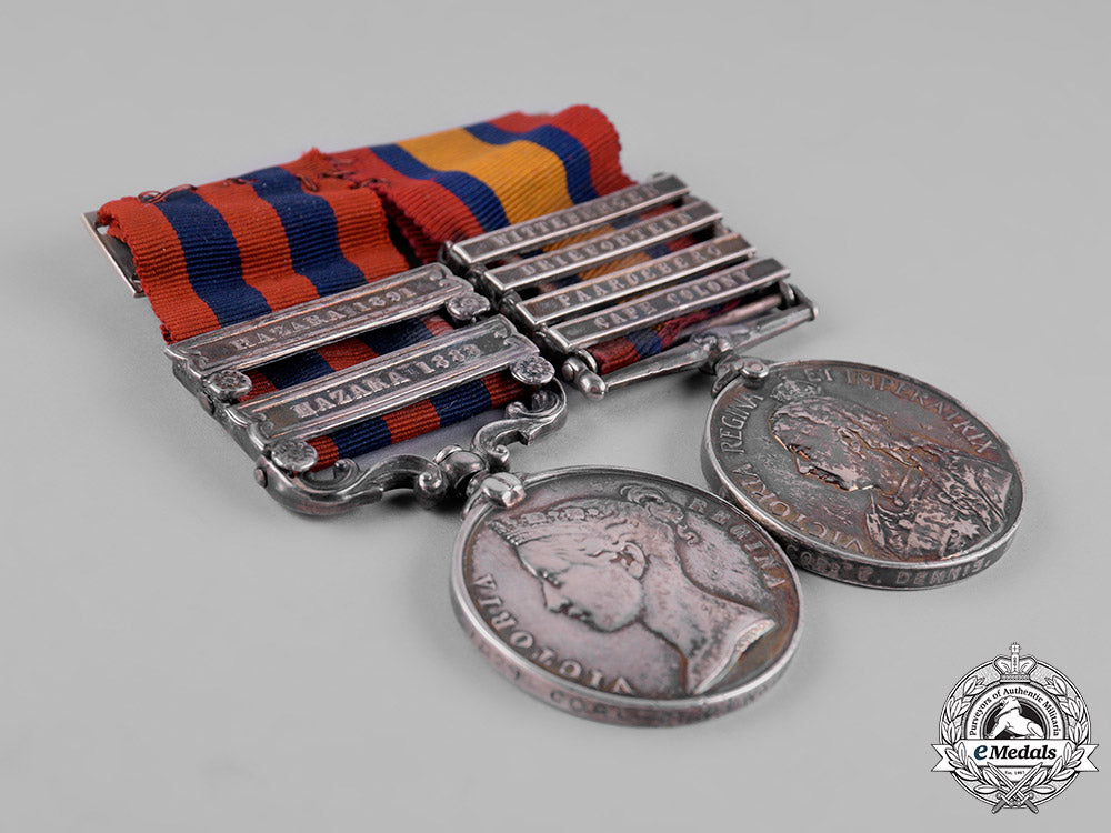 India General Service Medal 1854-1895, 2 Clasps - HAZARA 1888, HAZARA 1891 (1024 CORL: T. DENNIS, 2: SEA: HIGHRS:); and Queen's South Africa Medal 1899-1902, 4 Clasps - CAPE COLONY, PAARDEBERG, DRIEFONTEIN, WITTEBERGEN (1024 CORl T. DENNIS, 2: SEA: HIGHRS:). Naming is engraved on the IGSM and impressed on the QSA. Mounted to a suspension with swing bar pinback, the bar missing its catch, the QSA with a repaired suspension, both medals exhibiting bruising, edge nicks, along with wear in the naming and contact marks, original ribbons, the ribbon on the QSA exhibiting fraying, fine.
