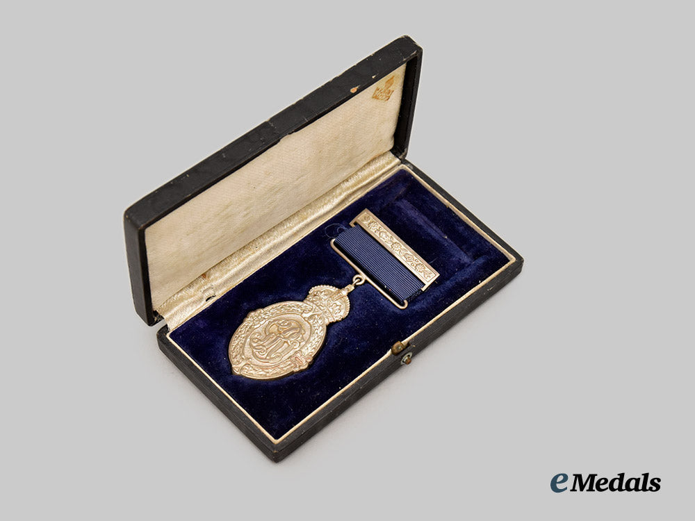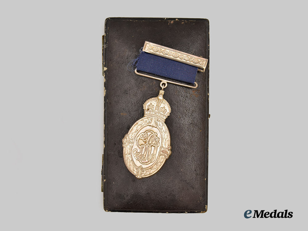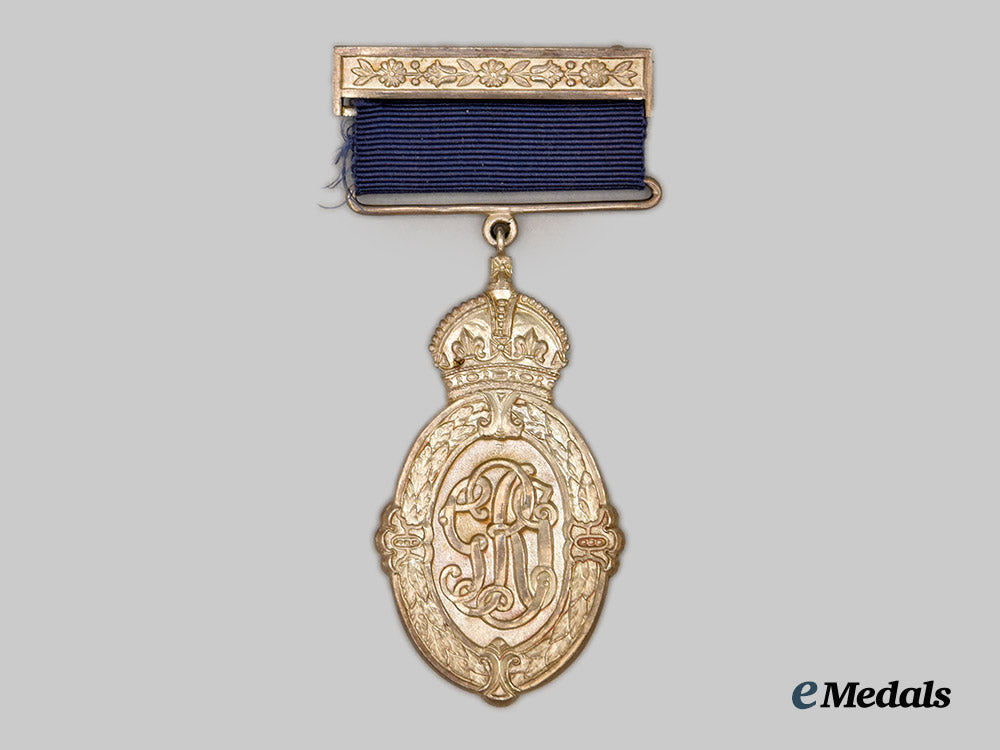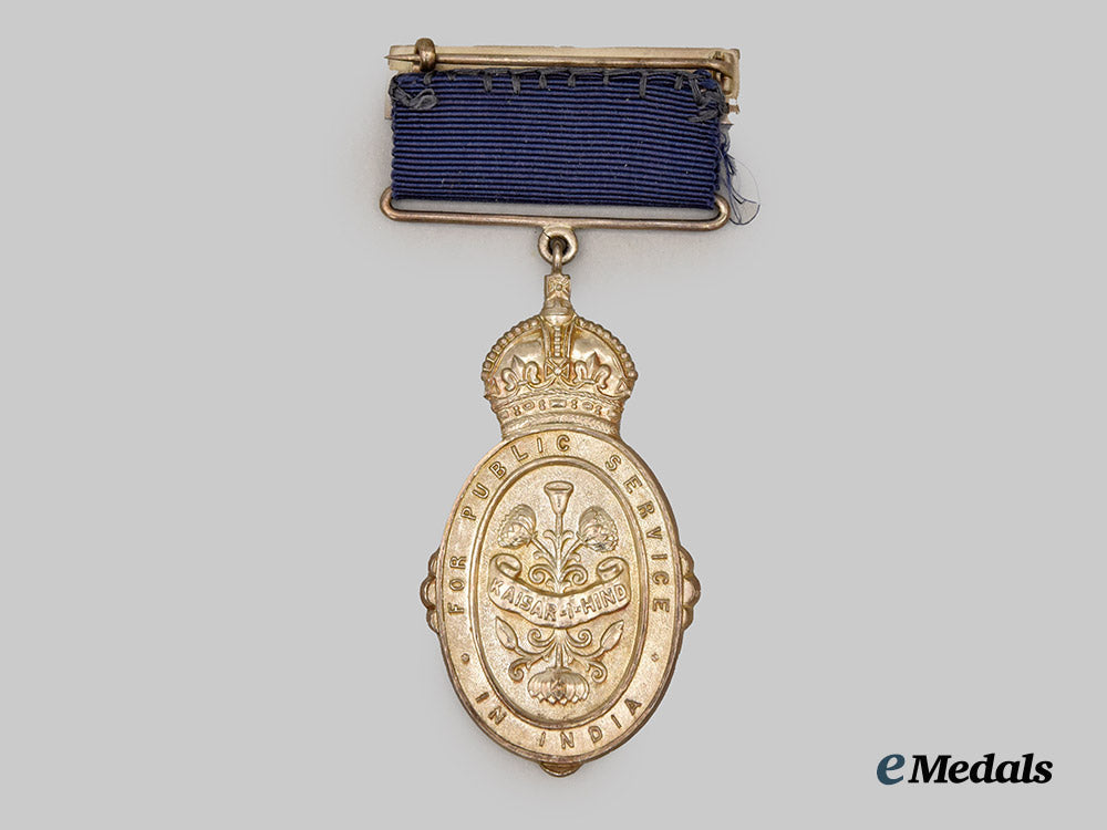 Instituted in 1900. George V. In silver, oval medallion enclosed by a laurel wreath, topped by a British crown; the obverse bears the monogram of King George V, the reverse bears the relief image of a flower superimposed by a scroll with the words KAISAR-I-HIND, surrounded by the words FOR PUBLIC SERVICE IN INDIA; original blue ribbon, suspended from a silver hanger, bearing a floral motif, with pinback; 64.2 mm (h) x 33 mm (w), extremely fine condition. In its hard-shelled case of issue, white satin lined on the inside lid, navy blue velvet medal bed, wear and scuffing on the exterior, fine condition.