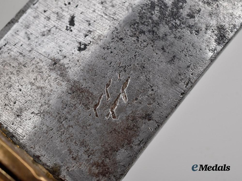 A late 19th Century naval cutlass, measuring 550 mm in total length, featuring the single edged curved blade measuring 420 mm, a carved ivory handle with cast gilt lion head pommel, and small single sided brass cross guard with decorative fan pattern and studded quillons, unmarked, demonstrating discolouration, chips and cracks in the ivory, pitting marks in the blade, missing the chain in place of a guard (noted by the hole in the cross guard tip and broken/worn ring on the lion’s nose), notable wear and contact marks throughout, in near very fine condition.