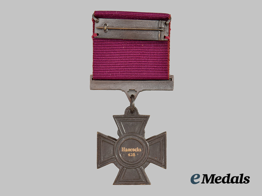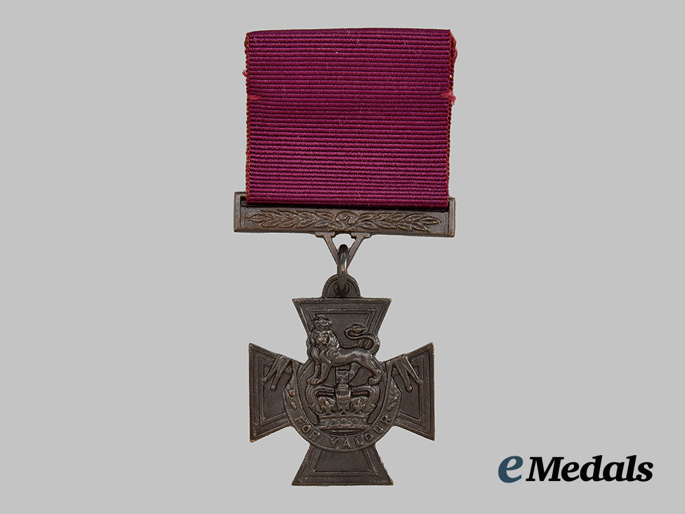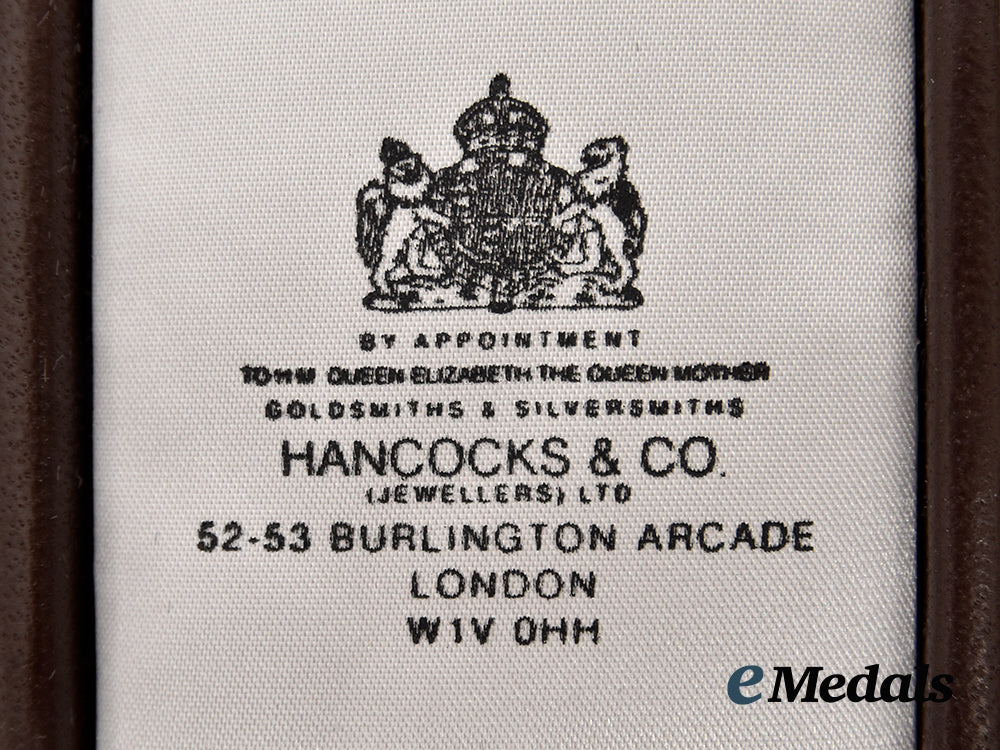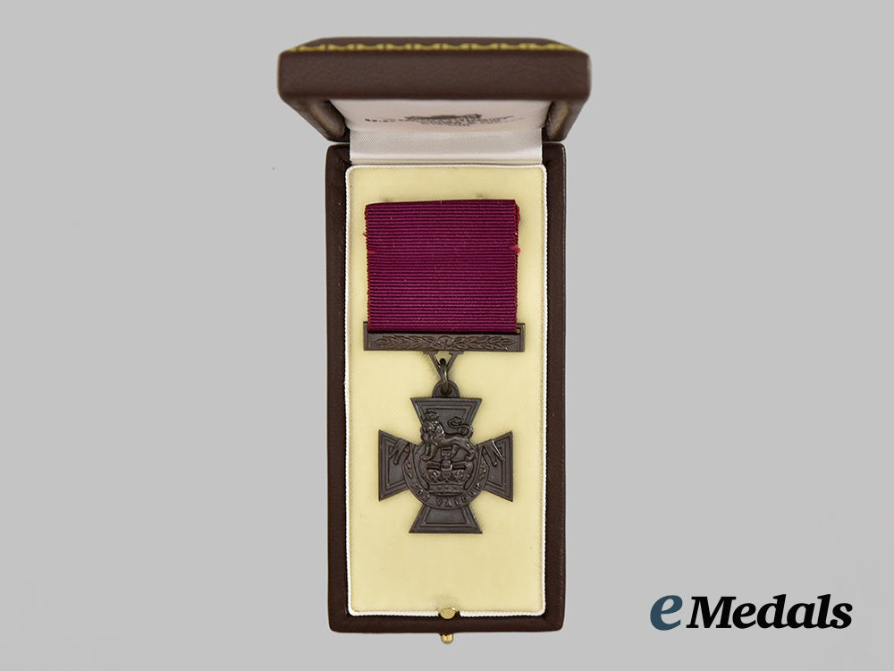 In blackened bronze, obverse of the cross illustrating the British lion standing upon the Victorian crown in the centre, framed by a ribbon banner inscribed "FOR VALOUR", reverse centrepiece engraved "Hancocks / 428", measuring 34 mm (w) x 39 mm (h) inclusive of its integral loop, the cross suspended by a ring from a serified "V" attached to the suspension bar decorated by laurel leaves, the ribbon with horizontal pinback. Near mint. In its hardshelled case of issue, walnut brown leather exterior, with gold-coloured trim on the lid, the inside lid in white satin, padded and maker marked "HANCOCKS & CO" (JEWELLERS) LTD 52-53 BURLINGTON ARCADE LONDON W1Y 0HH", slotted off-white felt medal bed, push release, hinged along the back edge, measuring 58.5 mm (w) x 121.5 mm (h) x 24.5 mm (d). Accompanied by a Certificate of Authenticity from Hancocks & Co. of London, inscribed "This Limited Edition Replica Victoria Cross numbered 428 was produced as a limited edition of 1352 by Hancocks & Co. (Jewellers) Ltd., the original manufacturers of the Victoria Cross since 1856", the certificate with the embossed Hancocks stamp and signed by Sales Manager Matthew Raymond, measuring 210 mm (w) x 297 mm (h), in a presentation folder.