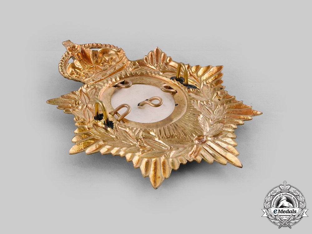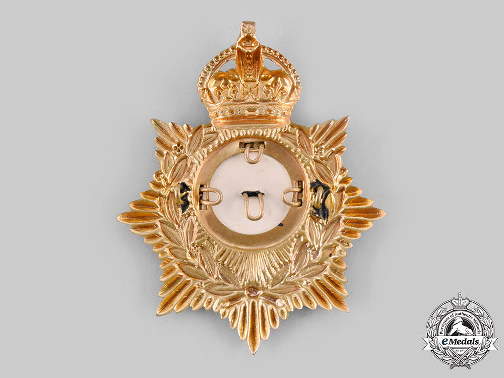 Two-piece construction, centrepiece insignia in bronze gilt with a silvered insignia within a circle inscribed "LINCOLNSHIRE", with a red and black wool striped swatch placed behind the insignia and highlighting the voided area, mounted to a seven-pointed star base with emanating rays and a wreath of laurel leaves framing the insignia, surmounted by a King's crown, measuring 106.5 mm (w) x 131 mm (h), extremely fine.