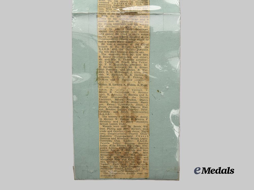 The newspaper clip reads “when the First World War broke out Mr. Thornley was assistant superintendent of the Crewe branch of the Wesleyan and General Assurance Society. He joined the Cheshire Regiment and was wounded at Passchendaele. He was awarded the Military Medal for carrying and dressing the wounded and acting as stretcher bearer under heavy fire for 24 hours without a break. A bursting shell buried him alive and when he was dug out his injuries were so severe that both his arms were amputated at the elbow.”