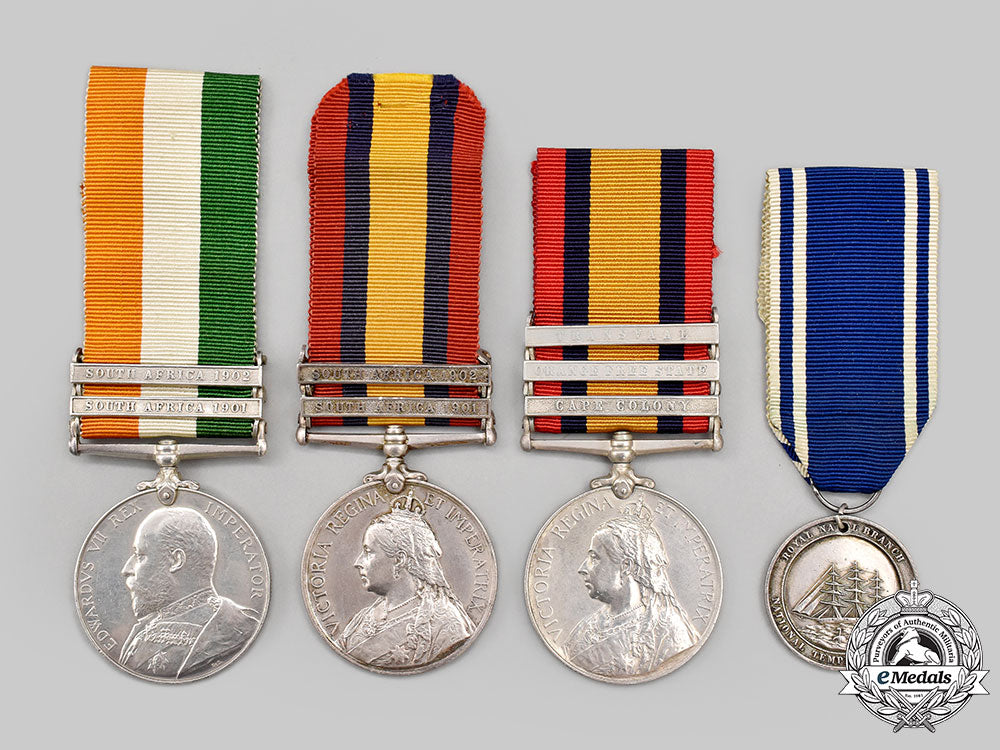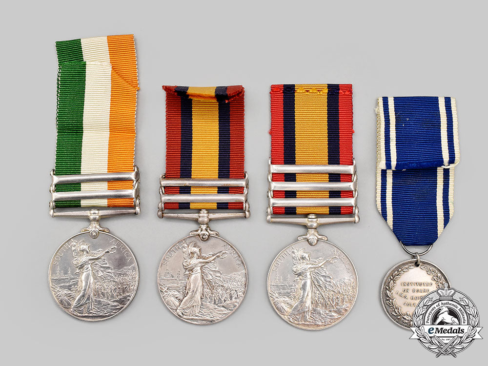 4. Royal Naval Branch, National Temperance League Five Year Medal: in silver, measuring 28.3 mm in diameter, bruised, edge nicks, original ribbon. Naming is officially impressed on the three Boar War medals.