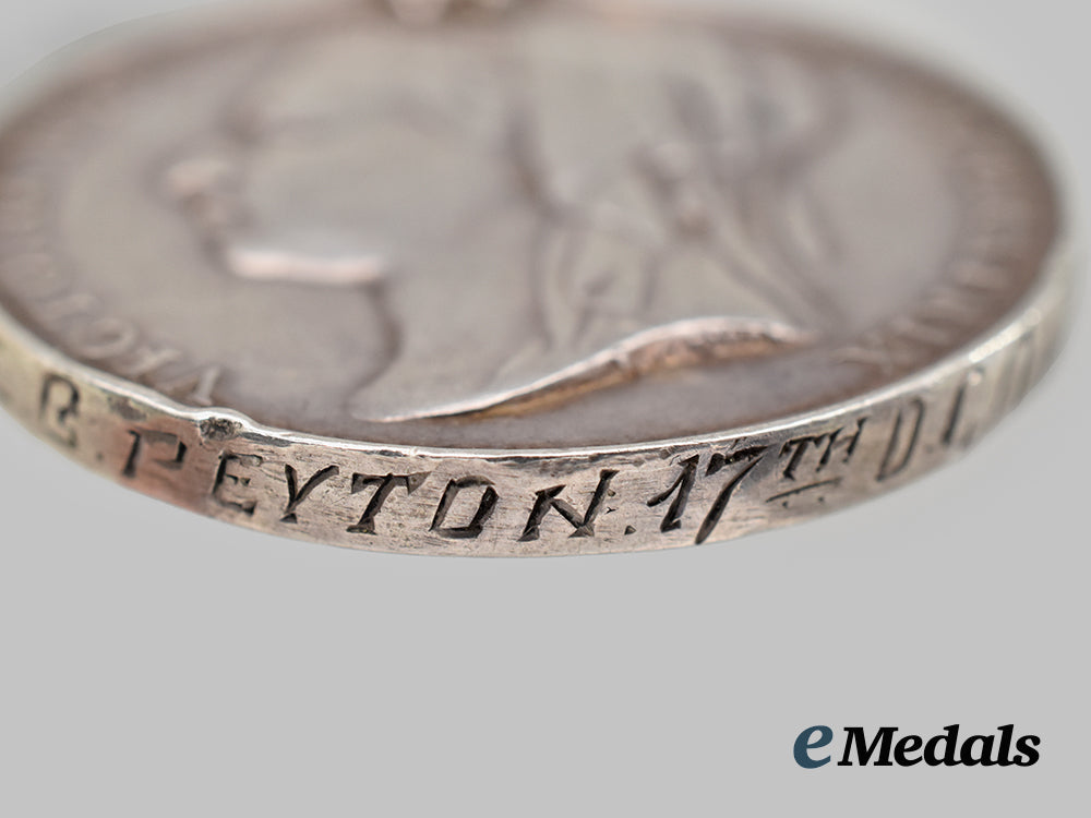 3. Egypt Medal 1881-1889 with 1882 Date, to Private E.G. Peyton, 17th (The Duke of Cambridge's Own) Lancers (1873. Pte E.G. PEYTON. 17th D.C.O. LANCERS.). Naming is re-engraved in large capitals. Edge nicks, bruised, without suspension.