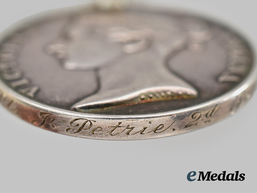 1. India General Service Medal 1854-1895, to Private J. Petrie, 2nd Seaforth Highlanders (808. Pt. J. Petrie. 2d Sea. High.). Naming is re-engraved in italic script. Contact marks, bruised, edge nicks, missing its suspension.