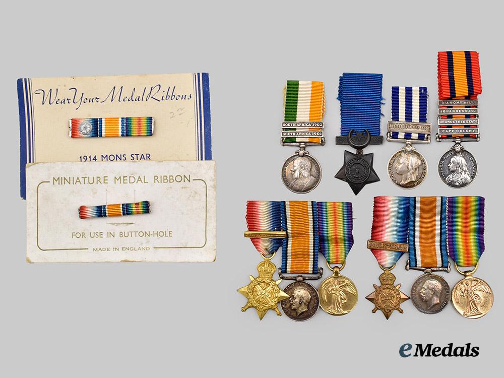All fine period strikings with crisp detailing, includes two Queens South Africa, Kings South Africa, Egypt Medal, and Khedive's Star, replacement ribbons, very fine. Also included are two unworn, 1914 Star, Victory and War Medal miniature groupings, each accompanied by miniature ribbon bar.