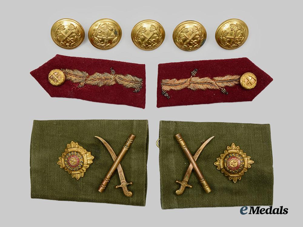 3. two Slip-On Shoulder Straps: both with a Major General's Pip in bronze gilt with red and green enamels, along with an insignia bearing a crossed baton and sword in bronze gilt, all of which are secured in place to an olive green cotton base via lugs and pins on their reverses, measuring 62 mm (w) x 82 mm (h) each.
