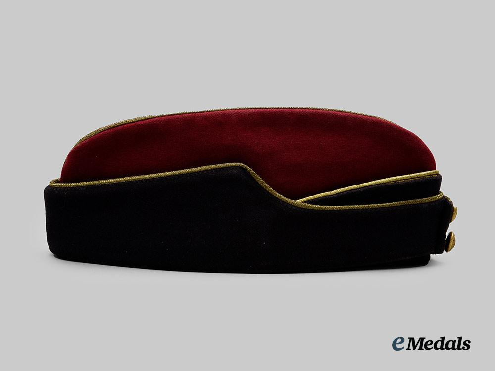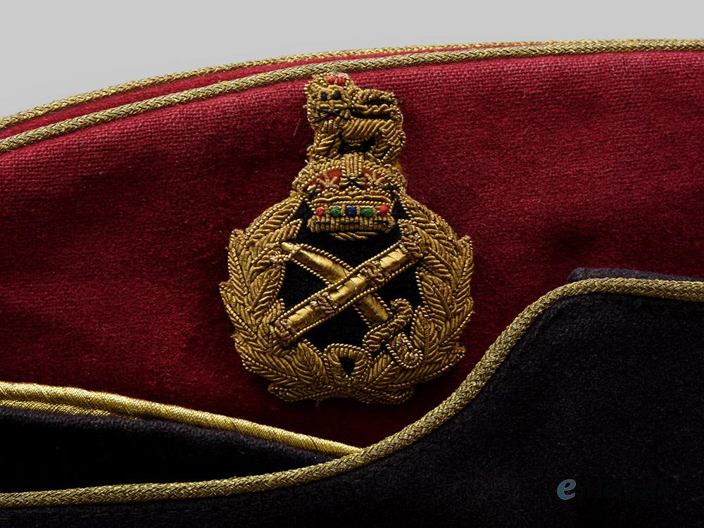 1. Royal Army Medical Corps Major General's Side Cap: fabricated from a navy blue and maroon brushed wool with fold down flaps on either side, two rising peaks forming a valley between the two panels, with the side edges and sloping edges trimmed in fine gold-coloured thatched-look bullion wire piping, with two brass buttons at the front each of which bears a crossed baton and sword within an open-ended wreath design, the left side near the front with a 48 mm (w) x 58.5 mm (h) General's cap badge stitched in place, the badge in rolled and beaded gold-coloured bullion wire, its baton and sword with bands of gold-coloured wire, with touches of red embroidery in the lion's ears and tongue, its eyes in black, the void of the crown in red, with touches of red, green and blue in the base of the crown, detailing of the lion's mouth and the crown in black threading, the cap badge padded and bearing black wool in the voided area behind the baton and sword, the interior of the cap lined in black rayon, with a 23 mm wide sweatband in black felt, measuring 300 mm in width x 110 mm in height, free of mothing, flaws and very clean.