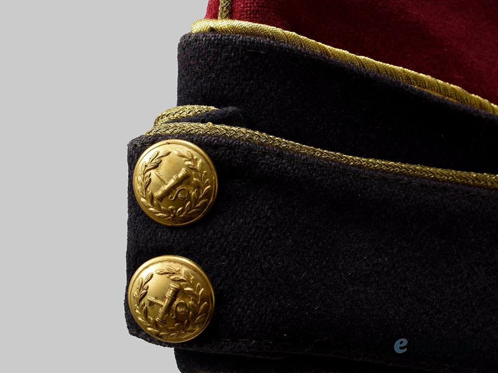 2. Collar Tab Pair: oak leaves and acorns design in gold-coloured bullion wire on the upper, on a maroon wool base, incorporating brass buttons each bearing a crossed baton and sword within an open-ended wreath design representing the rank of Major General, measuring 32 mm (w) x 85 mm (h) each.