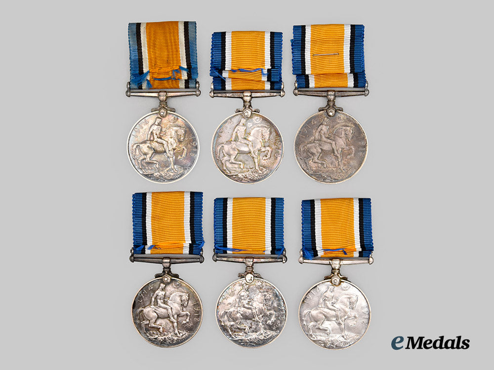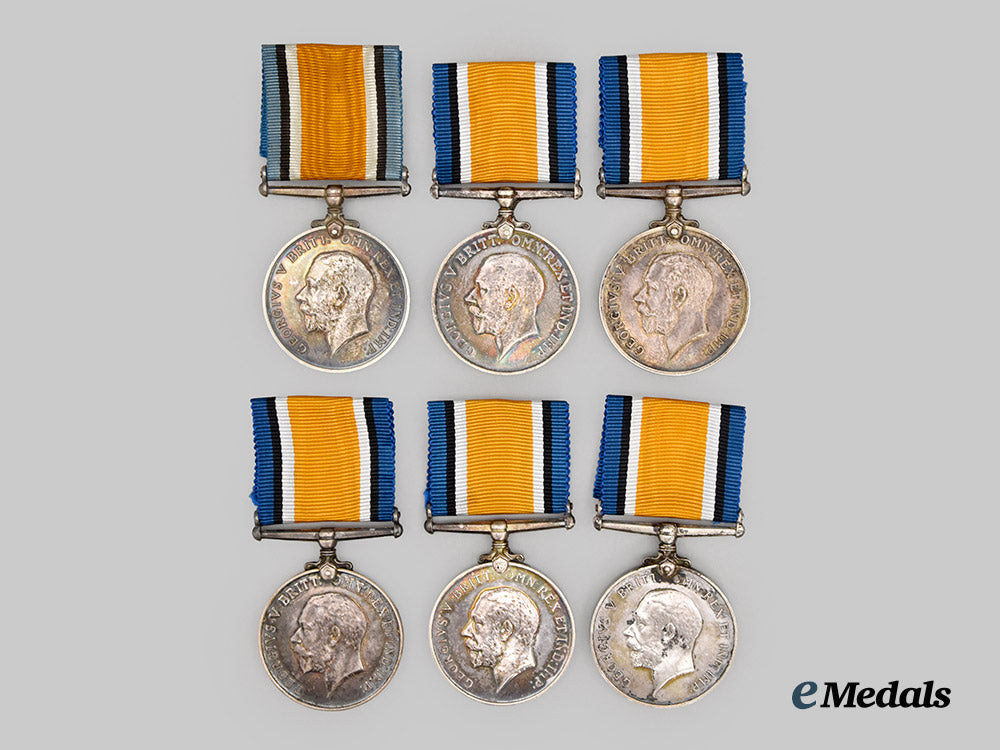 A lot of six British War medals, consisting of a round silver medal, suspended from a single-toe horizontal medal bar from a correct replacement ribbon, the obverse depicting the leftward facing effigy of King George V and inscribed “Georgivs V Britt: Omn: Rex Et Ind: Imp:” (George V, King of all the British Isles and Emperor of India) in capital letters, the reverse depicts Saint George naked on horseback and armed with a sword, the horse trampling on the Prussian eagle shield as well as skull and crossbones, along with ocean waves and a rising sun in the background, as well as the years “1914” and “1918”, measuring 36.0 mm in diameter, weighing 32.8 grams, the edges are inscribed as follows: