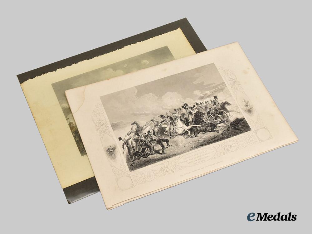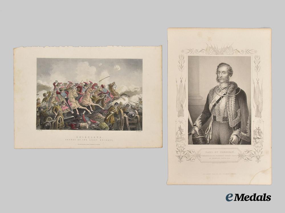 A lot of six etchings depicting key engagements and personnel of the Crimean War, each presented on off-white paper stock with captions and latticework framing, with one example carefully hand-coloured, all measuring approximately 28 cm (w) x 18.5 cm (h), some demonstrating edge creasing and most with minor to moderate damp staining, in overall very fine condition.