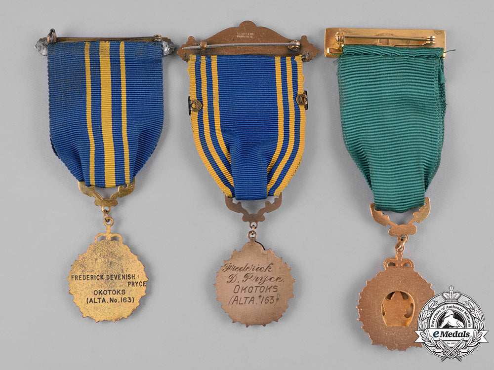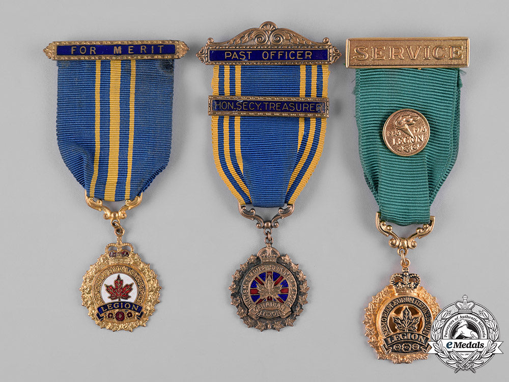 Three Royal Canadian Legion Medals (first medal with a two-piece construction, in bronze with red and blue enamels, engraved in running script "Frederick D Pryce. OKOTOKS (ALTA. #163)" on the reverse, measuring 27.2 mm (w) x 29.7 mm (h), "HON. SECY. TREASURER" clasp on its original ribbon, suspended from a hanger with pinback inscribed "PAST OFFICER" and maker marked "SCULLY LTD. MONTREAL"; second medal in bronze gilt with red, white and blue enamels, engraved "FREDERICK DEVENISH PRYCE OKOTOKS (ALTA. No. 163)" on the reverse, measuring 27.5 mm (w) x 31.7 mm (h), original ribbon, suspended from a hanger with pinback inscribed "FOR MERIT"; third medal in bronze gilt with black enamels, measuring 27.7 mm (w) x 32.7 mm (h), "LEGION 1926-1976" clasp affixed to its original ribbon, suspended from a hanger with pinback inscribed "SERVICE").