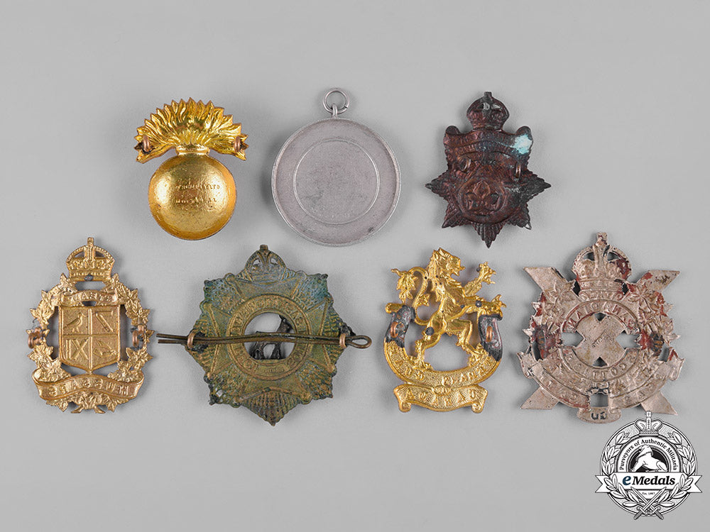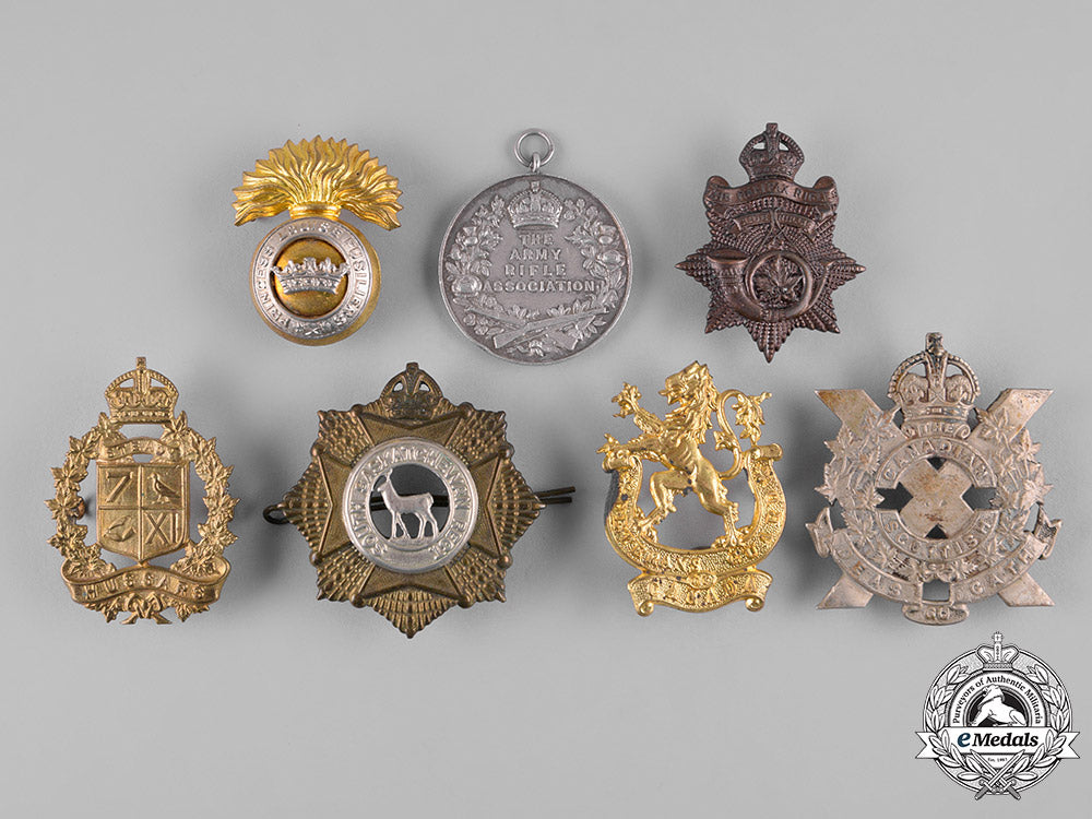 Six Canadian Cap Badges: Canadian Scottish Regiment (in silver, maker marked "BIRKS" on the reverse, measuring 50.3 mm (w) x 57 mm (h), missing its lugs); Halifax Rifles Cap Badge (in bronze, measuring 37.5 mm (w) x 47 mm (h), intact lugs); Princess Louise Fusiliers Cap Badge (two-piece construction, silvered insignia, mounted to a bronze gilt base, maker marked "W SCULLY LTD MONTREAL" on the reverse, measuring 34 mm (w) x 41.5 mm (h), intact lugs); 7th-11th Hussars (in bronze gilt, measuring 38.5 mm (w) x 52 mm (h), intact lugs); South Saskatchewan Regiment Cap Badge (in bronze, measuring 52 mm (w) x 53.5 mm (h), intact lugs and pin); and Veterans Guard of Canada Cap Badge (in bronze, measuring 35.3 mm (w) x 36.2 mm (h), intact lugs).