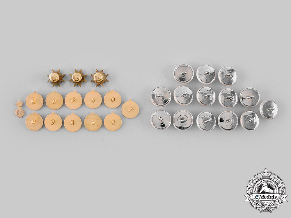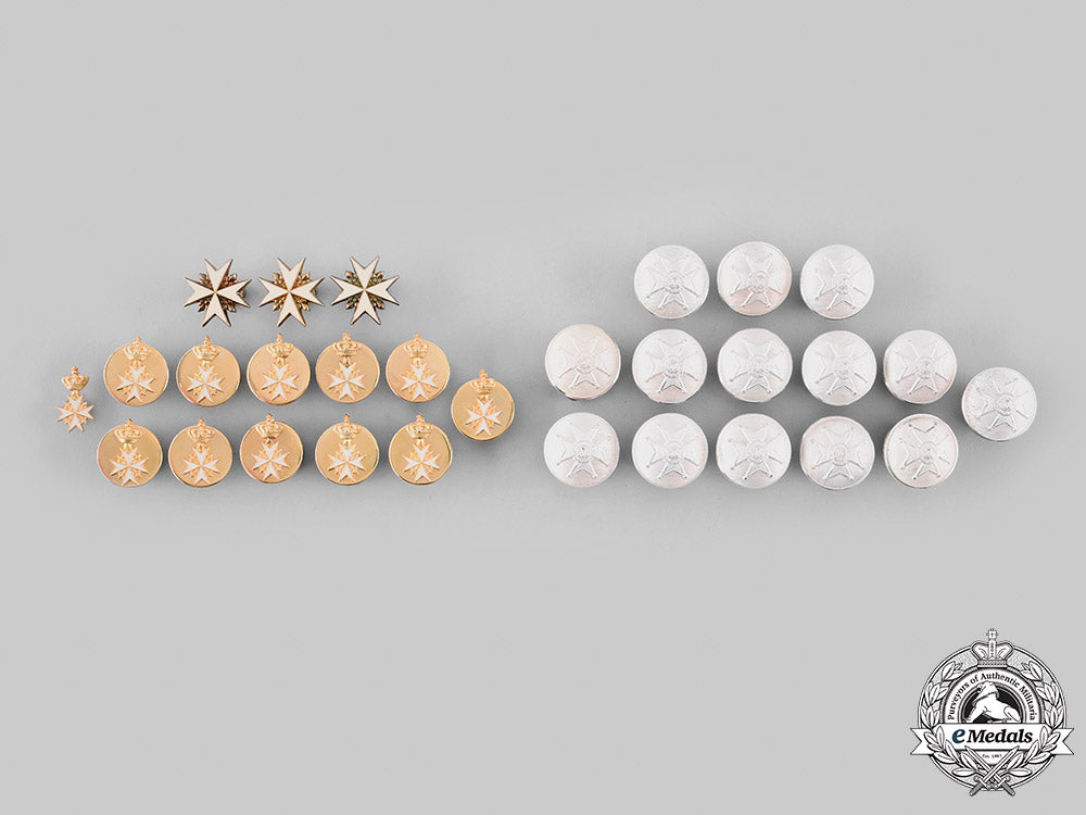 Fifteen Most Venerable Order of the Hospital of St. John of Jerusalem (Order of St. John) Items, including: three Lapel Badges (in silver gilt with white enamels, maker marked "SPINK LONDON" on their reverses, measuring 19 mm (w) x 19 mm (h) each, all with a single push pin); Small Insignia (two-piece construction, in bronze gilt with white enamels, measuring 10.8 mm (w) x 18.8 mm (h), without attachment); and eleven Vestment Buttons (two-piece construction, insignia in bronze gilt with white enamels, mounted to bronze gilt circular base, measuring 17.7 mm (w) x 20.3 mm (h) each, all with intact loops); accompanied by fourteen Pontifical Equestrian Order of St. Gregory the Great Vestment Buttons (in frosted silver, measuring 20.8 mm in diameter each, all with intact loops). Intact enamels, near extremely fine.
