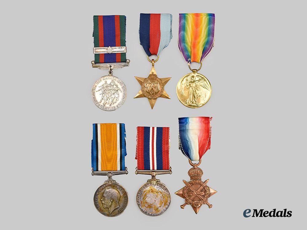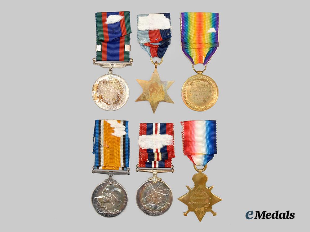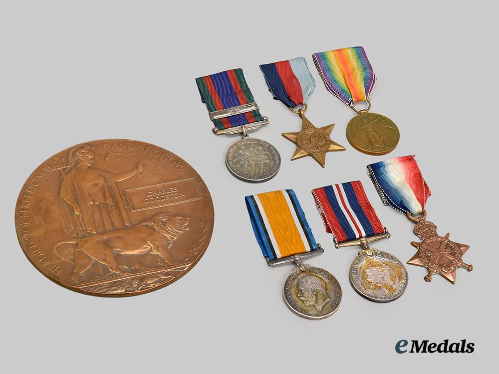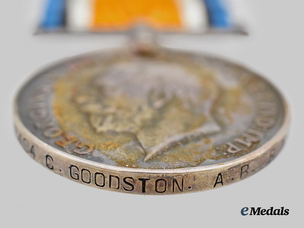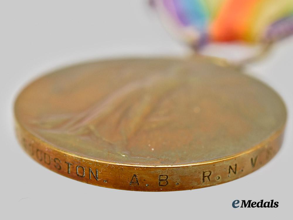 1. First War British Group of Three, to Able Seaman Charles Goodston, Royal Naval Volunteer Reserve: 1914-15 Star (CZ.2404, C. GOODSTON, A.B., R.N.V.R.); British War Medal (C.Z.2404 C. GOODSTON, A.B. R.N.V.R.); and Victory Medal (C.Z.2404 C. GOODSTON, A.B. R.N.V.R.). Naming is officially impressed. Un-mounted, cleaned, light glue residue evident on all three awards and paper residue present on the original ribbons from previous board mounting. Accompanied by his Memorial Plaque (CHARLES GOODSTON). Very fine.