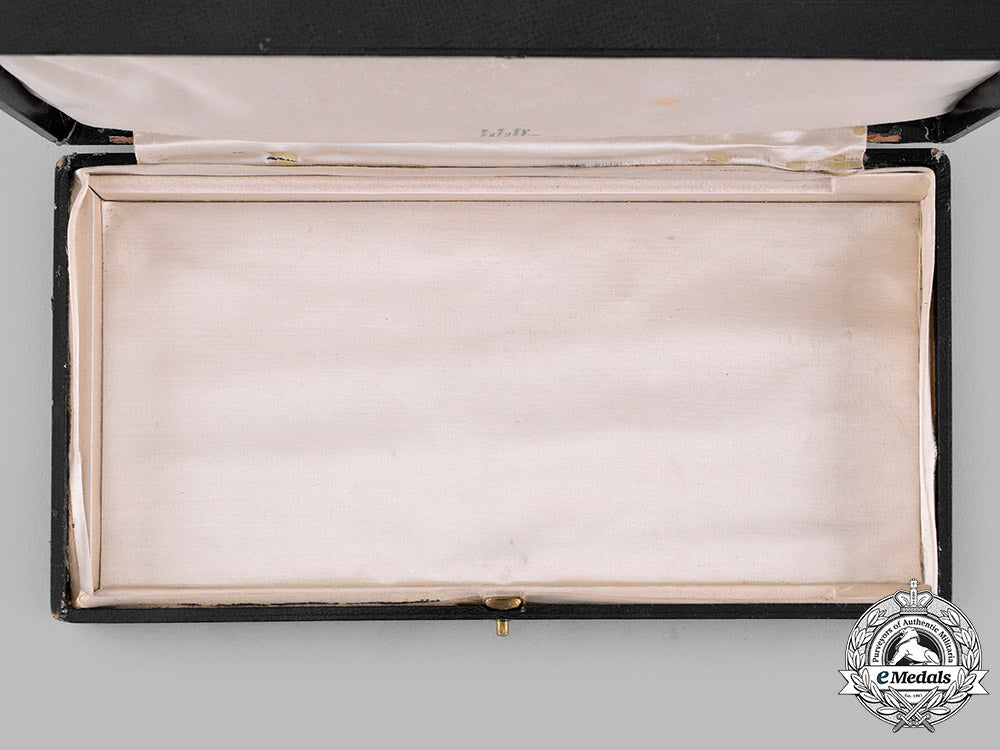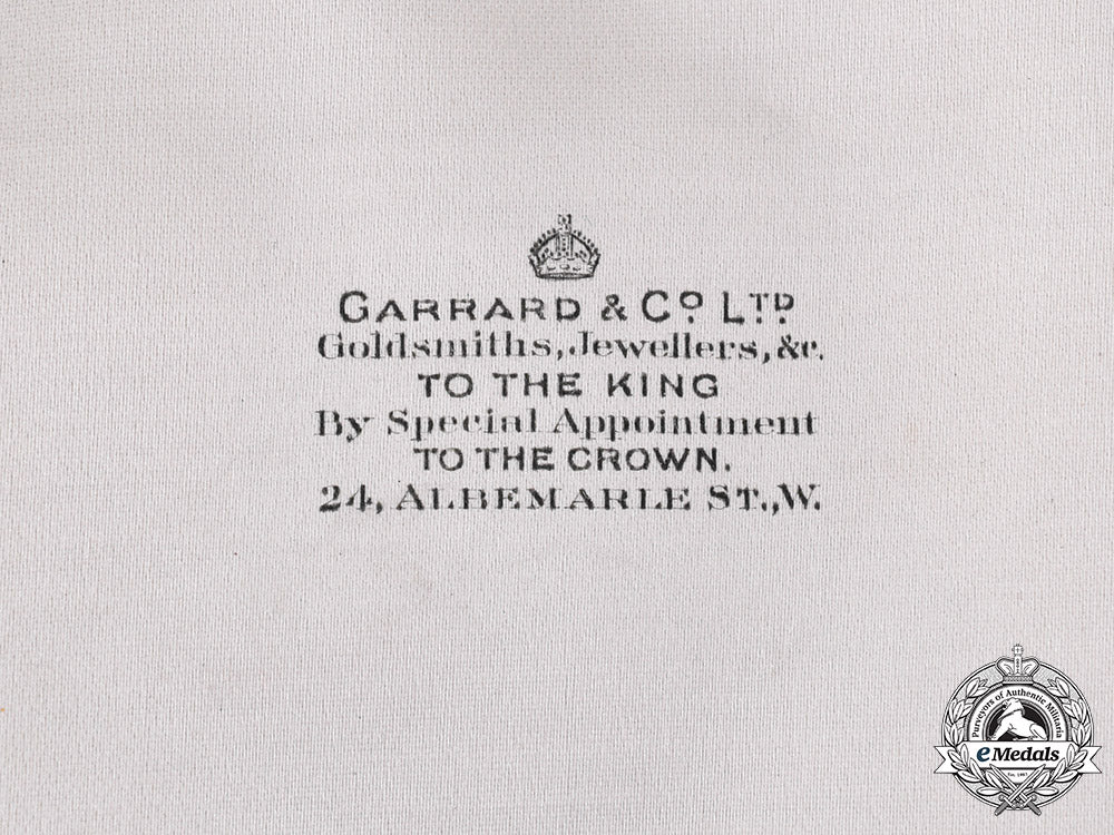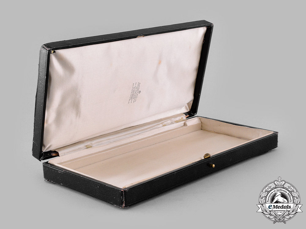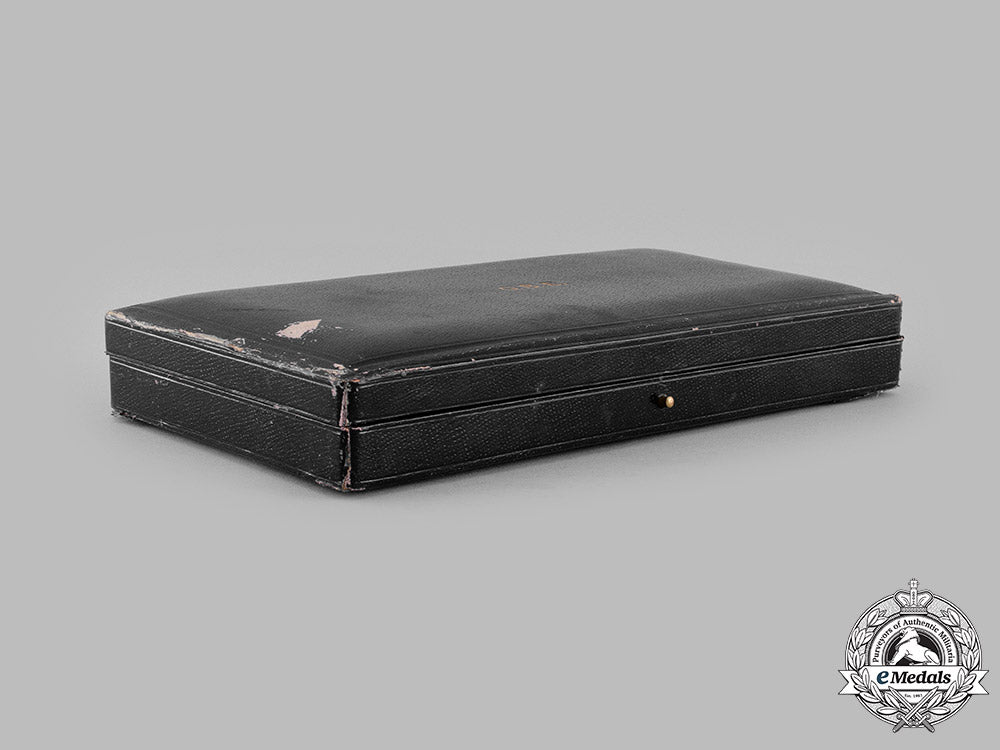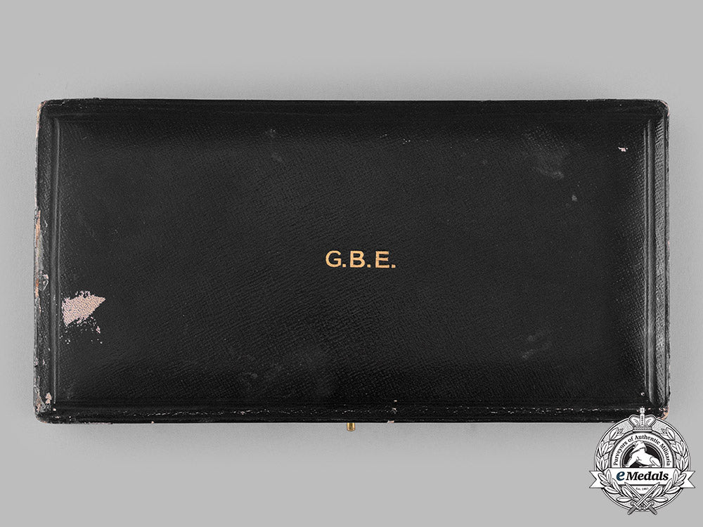 Instituted in 1917. Hardshelled design on both the lid and base, wooden-framed, the exterior with a black dimpled cloth covering on five sides, the bottom with a black pebbled cloth covering, the lid inscribed "G.B.E." in gold-coloured ink, inside lid lined in white satin, padded, marked with the King's crown above the maker mark "GARRARD & Co. Ltd. / Goldsmiths, Jewellers, &c. / TO THE KING / By special appointment / TO THE CROWN. / 24, ALBEMARLE ST., W." and exhibiting the impressions of the once present badge and breast star, the base with a white fabric-wrapped cardboard insert placed within it and lined in white satin in the bottom, the case missing its raised platform with the medal beds for the badge and breast star, dual-hinged on the left side, push release closure, measuring 147 mm (w) x 292 mm (h) x 47 mm (d), wear, scuffing and light soiling evident in the black cloth covering on the exterior and on the lips of both the lid and base, thereby exposing the underlying wooden framework, light soiling present on the white satin on the inside lid, scattered wear evident in the fabric overlying the hinged area, fine.