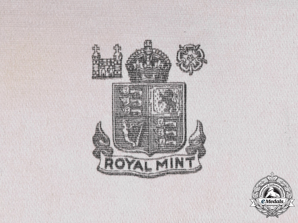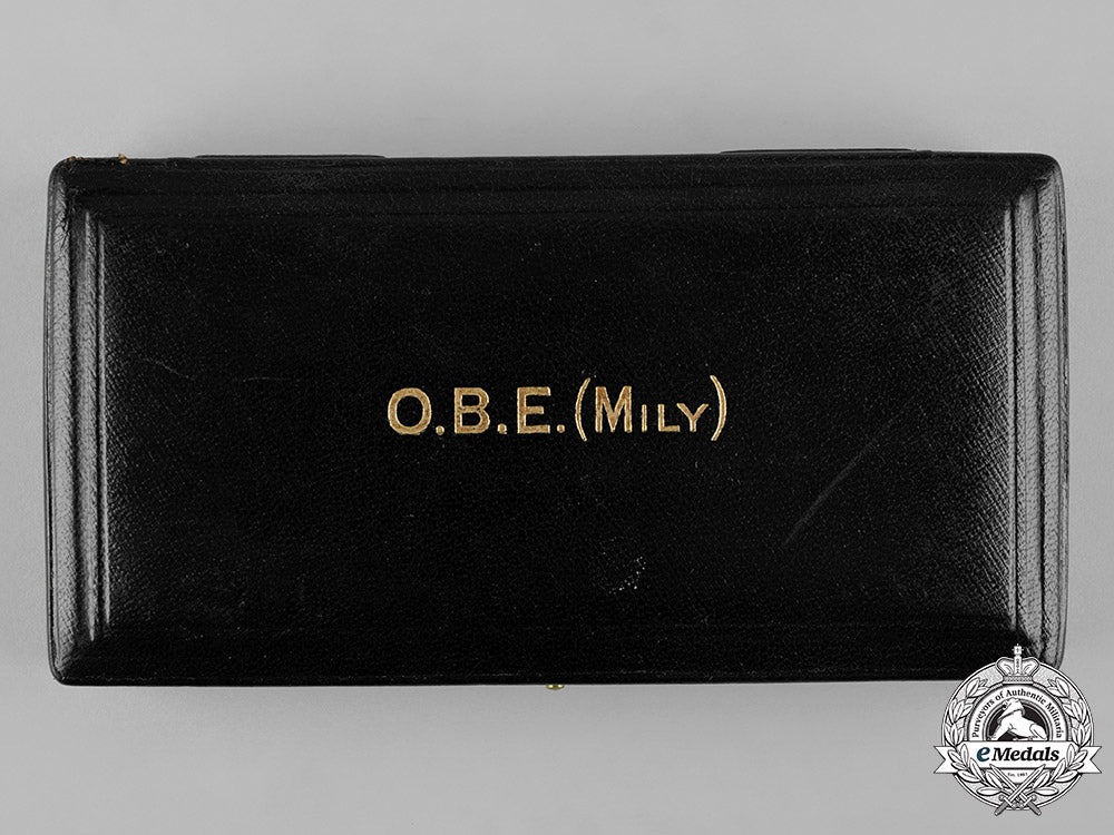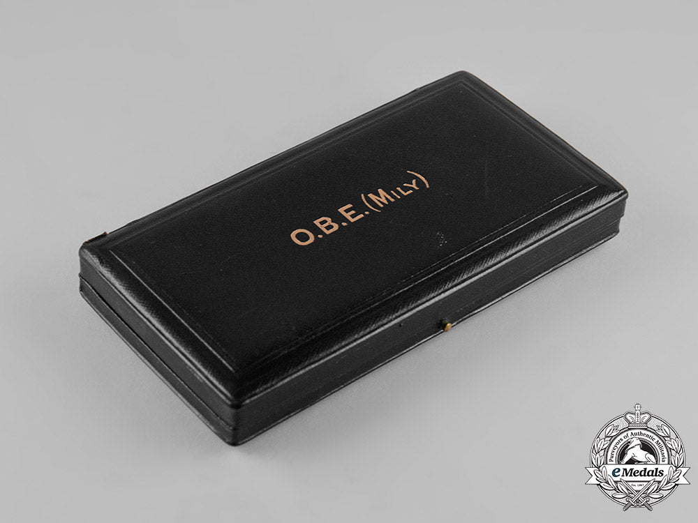 Instituted 4 June 1917. A presentation case for a Military Division Officer Badge of the Most Excellent Order of the British Empire, constructed of a wood frame with a faux black leather exterior, the obverse lid with a gold embossed inscription of “O.B.E. (MILY)”, the interior with a white satin-type lid liner and intact hinge cover, bearing the coat of arms of the Royal Mint, with a slotted and depressed white doeskin medal bed, opening with a functional bronze spring catch with exterior stud release and dual functional magnetic metal hinges, measuring 137 mm (w) x 72 mm (l) x 18 mm (h), accompanied by a period original card with instructions for wear, measuring 118 mm (w) x 57 mm (h), in extremely fine condition.