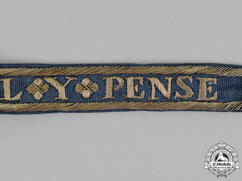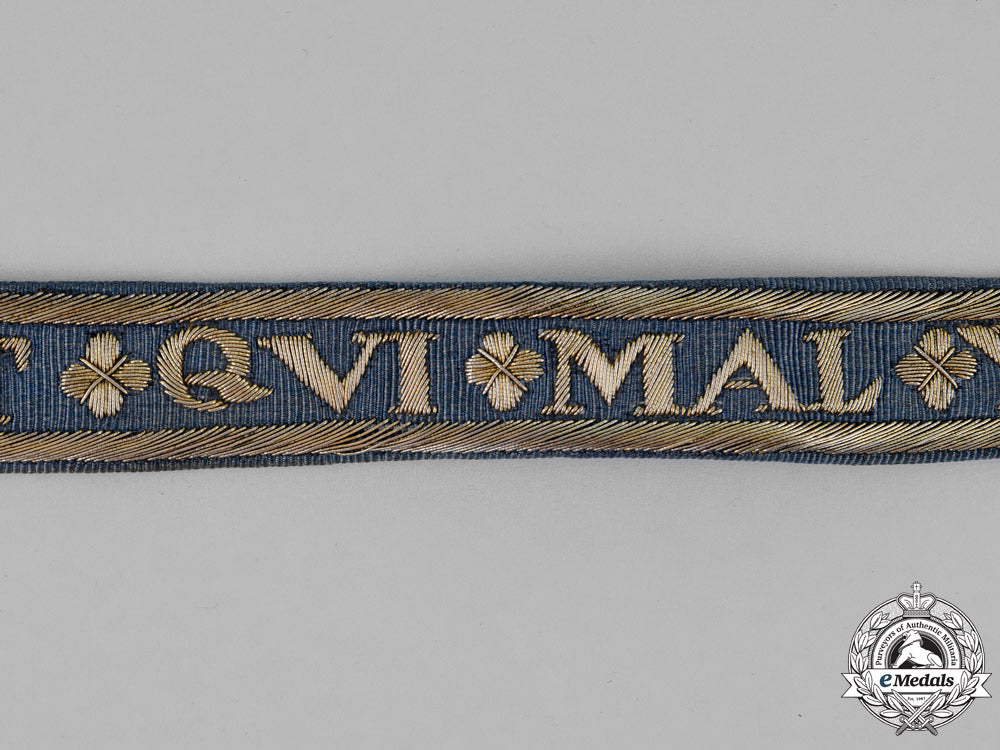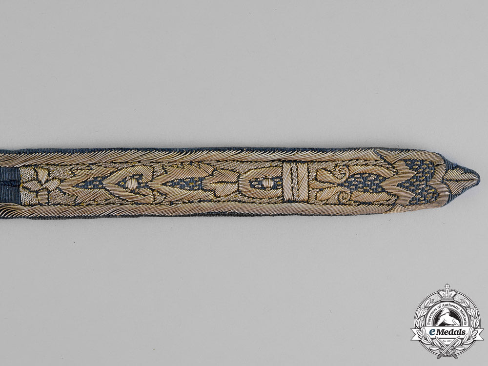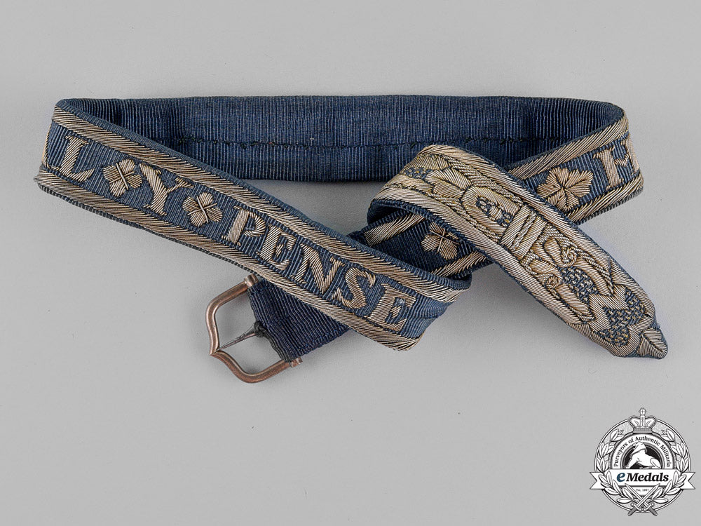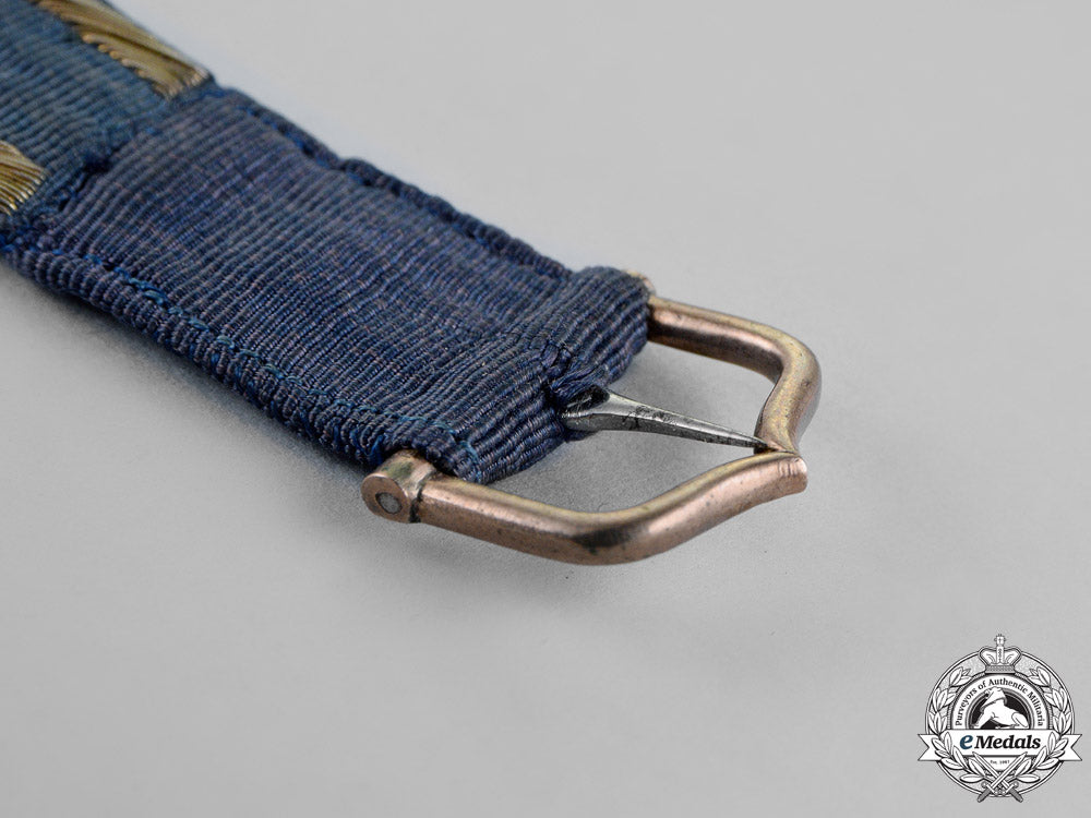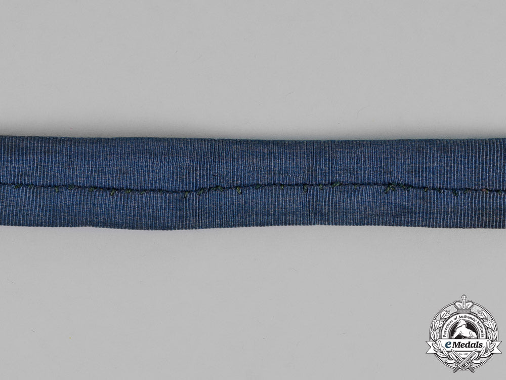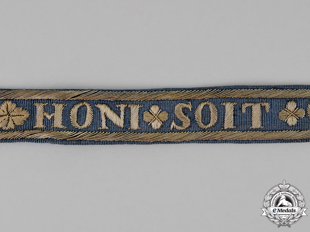 A 19th Century Garter, in blue silk with embroidered with silver-gilt wire, fitted with silver gilt buckle and iron pin, measuring 49.7 cm (l) x 2.0 cm (w), with small period repair, otherwise extremely fine.
