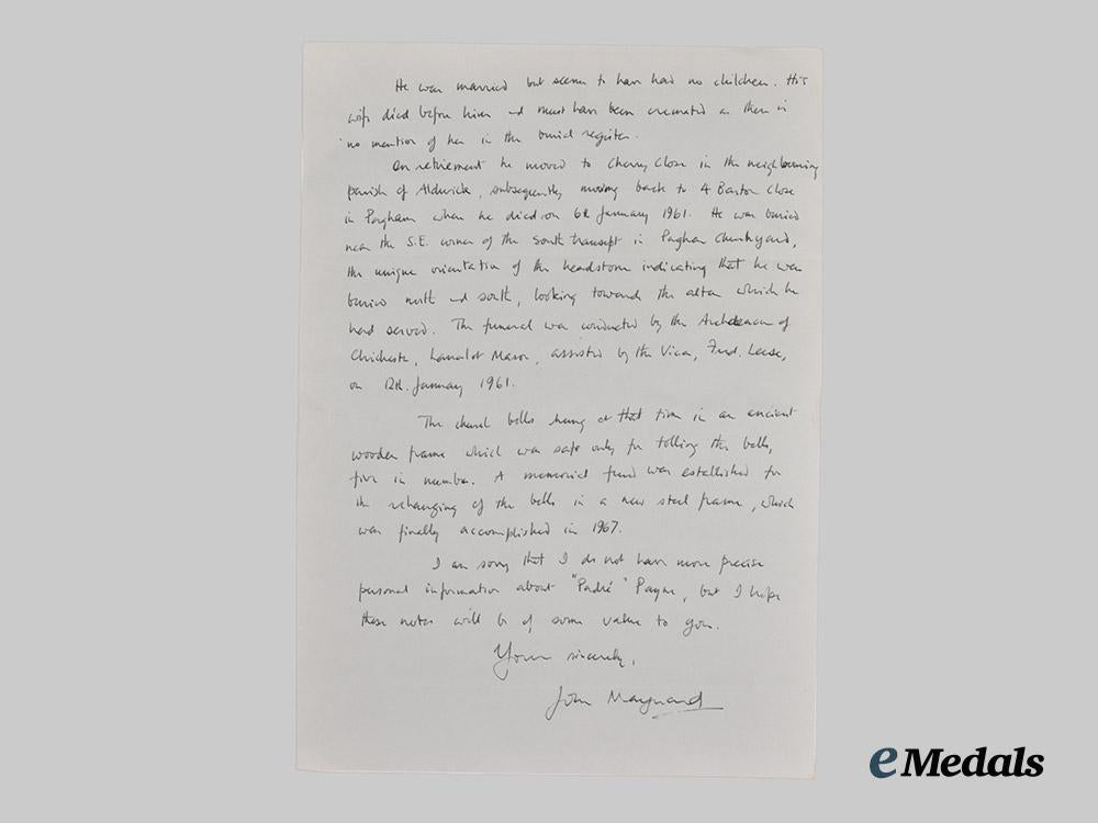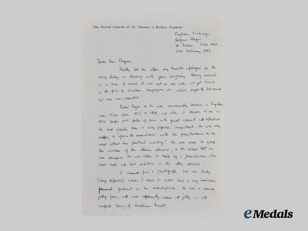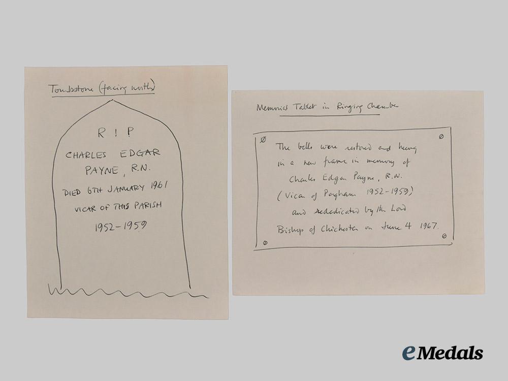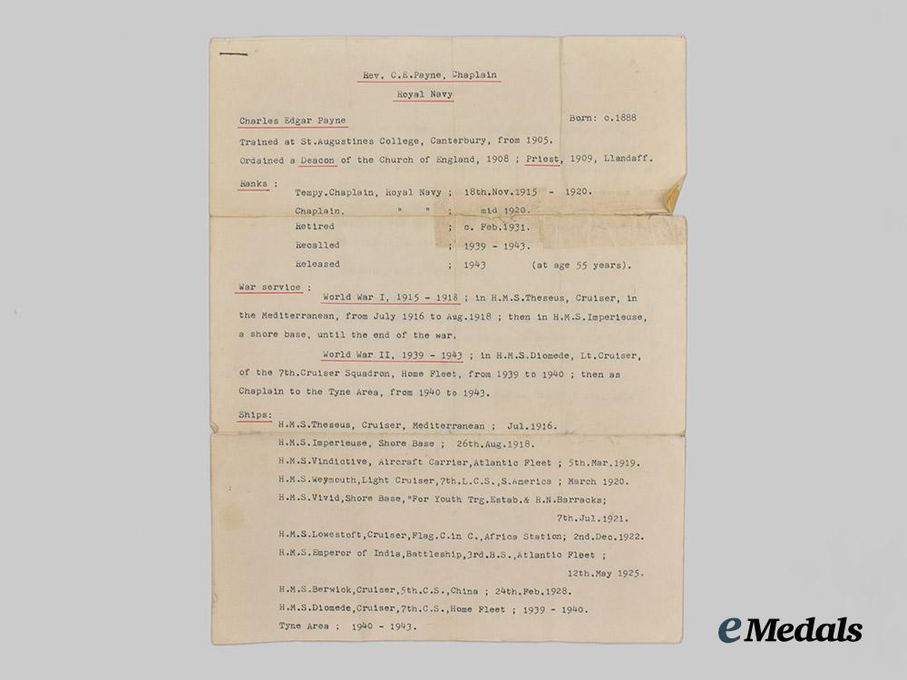 Footnote: Charles Edgar Payne was born in 1888 and underwent theological training at St. Augustine’s College, Canterbury from 1905. Ordained as a Deacon in the Church of England in 1908, he was later appointed Curate of St. John the Baptist Church in Newport, Monmouthshire, holding this position for two years before becoming Curate of All Saints, Beaconsfield, South Africa from 1910 until 1911. He was later Priest-in-Charge in Berkley West, South Africa from 1911 until 1913. Returning to England, Payne became Curate of St. Mary's, Plaistow, Bromley in 1914, and later Chaplain for the Society for the Propagation of the Gospel, St. Vincent, Windward Isles from 1914 until 1915. He was then appointed Temporary Chaplain to the Royal Navy, and was tasked with ministering to the crews of armed merchant cruisers operating in the South Atlantic. Payne later served aboard H.M.S. Theseus in the Mediterranean from July 1916 until August 1918, subsequently transferring to Shore Base H.M.S. Imperieuse on 26 August 1918. Payne was later transferred to the aircraft carrier H.M.S. Vindictive on 5 March 1919, the light cruiser H.M.S. Weymouth in March 1920, and joined Shore Base H.M.S. Vivid (youth training establishment) on 7th July 1921. His storied career continued, transferring to H.M.S. Lowestot on the Africa Station on 2nd December 1922, later shifting to H.M.S. Emperor of India on 12 May 1925 and H.M.S. Berwick on 24 February 1928. Payne then left the Royal Navy and served as Chaplain to the Missions to Seamen in Yokohama, Japan, from 1931 until 1934, before returning to England to fulfill a number of clerical roles. During the Second World War, Payne returned to Royal Navy service, serving aboard H.M.S. Diomede from 1939 until 1940, before ministering to personnel in the Tyne area from 1940 until 1943. Once again retiring from naval service, Payne ended his career as vicar of St. Thomas à Becket's Church, Pagham from 1952 until 1959, before passing away on 6 January 1961, subsequently being buried in the churchyard there.