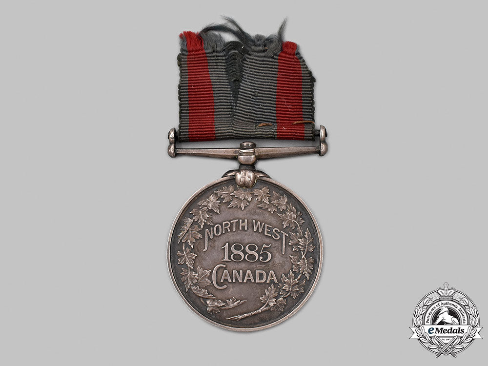 Footnote: The North West Canada Medal is a British campaign medal issued to the soldiers, volunteers, and North-West Mounted Police (NWMP) personnel who participated in putting down the North-West Rebellion in 1885. The medal was established by the Canadian Government in September 1885 after consultation between the Governor General of Canada and the British Secretary of State for the Colonies. It was awarded to those who took part in the suppression of the North-West Rebellion of 1885 and who served west of Port Arthur, Ontario. Recipients included a number of volunteers, including the crew of the steamer "Northcote" for service at the Battle of Batoche, and members of the Prince Albert Volunteers for service at the Battle of Duck Lake. Initially, members of the NWMP were not eligible. However, a Canadian Order in Council of December 13, 1886 recommended that the NWMP receive the medal, this being accepted by the British Government on February 16, 1887. A total of 920 medals were then awarded to the NWMP. No British Army units took part, although seventeen British Army officers were attached to Canadian units. All those who received the medal, except for members of the NWMP, also received a grant of 320 acres of land, or scrip of $80 in lieu. During the 1930s, surviving NWMP recipients were each granted $300.
