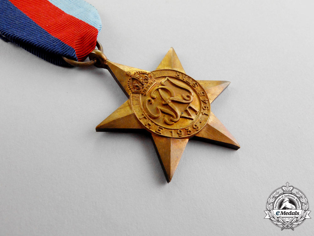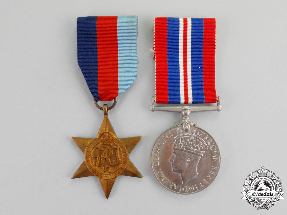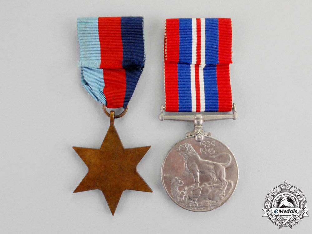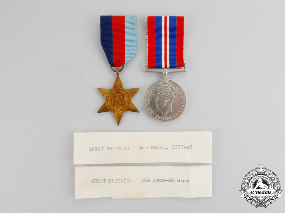 A pair of medals, including a 1939-1945 Star, constructed of bronze, measuring 37.95 mm (w) x 49.81 mm (h), on loop for suspension from period original ribbon, and in extremely fine condition. Accompanied by a War Medal 1939-1945, constructed of silver, measuring 36.25 mm in diameter, on loop for suspension from period original ribbon, and in extremely fine condition.