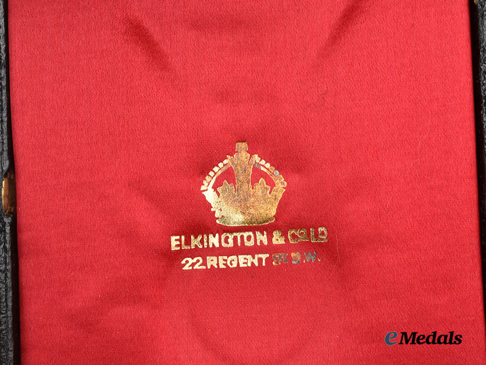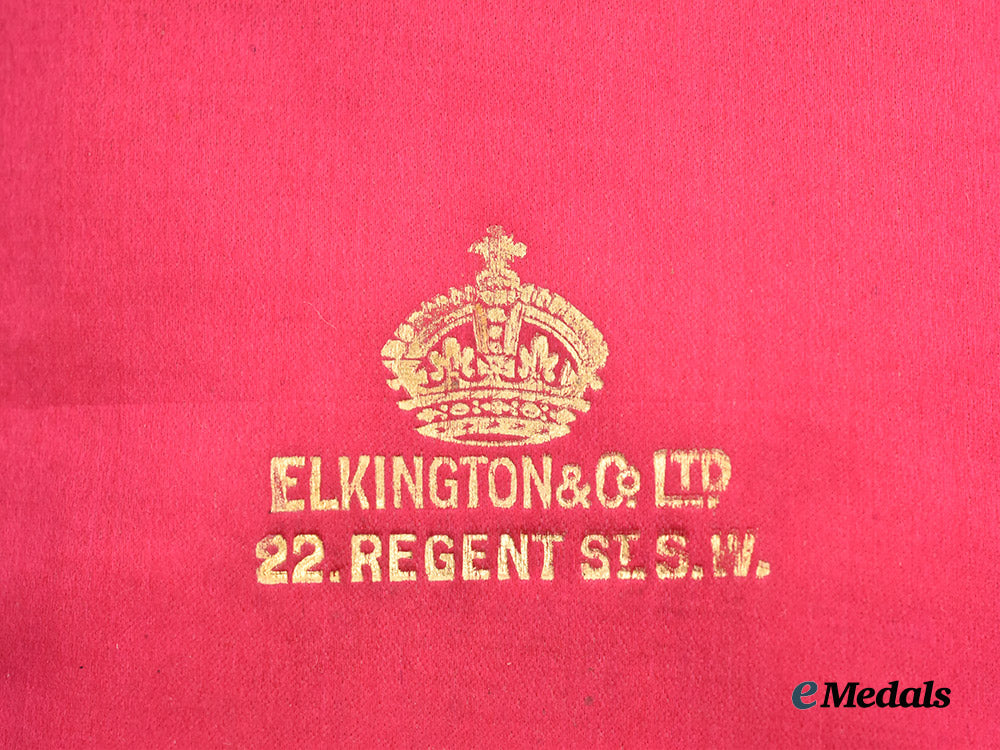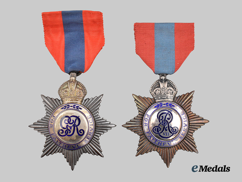 2)An Edward VII Imperial Service Medal: An eight-pointed silver star, with the top ray obscured by a crown, the center medallion bering the royal cypher of Edward VII, surrounded by the words 'For Faithful Service', 63 mm (h) x 55.7 mm (w), original ribbon, reverse pin marked ELKINGTON 22 REGENT ST SW, extremely fine. In a hard-shelled case, red satin lined on the inside lid, red velvet medal bed, marked ELKINGTON & CO, extremely fine condition.