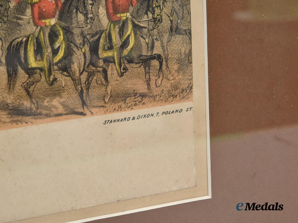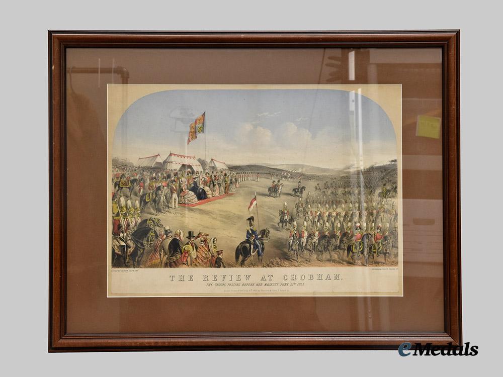 A framed and hand-coloured lithograph on paper, titled “The Review at Chobham - The Troops Passing Before Her Majesty”, by August Butler and published by Stannard & Dixon. The lithograph depicts Queen Victoria seated with most of the Royal party standing, while cavalry regiments parade past them, with tents and thousands of infantry troops in the background. It is contained behind a flat pane of glass, featuring a light brown mounting board, with an ornate chocolate-brown wooden frame. The reverse features a khaki paper backer with a twisted magnetic wire, mounted to either side of the frame, to allow for wall hanging. The frame including the lithograph measures 66 cm (w) x 52 mm (l). The lithograph has been altered, with rounded edges at the top. It is free of stains, rips, or tears, with bright colours remaining and only light age spotting throughout. The frame with a small chip missing out of the top section, in overall near extremely fine condition.