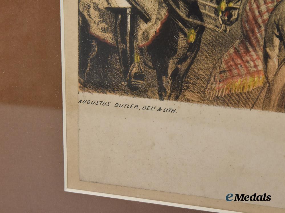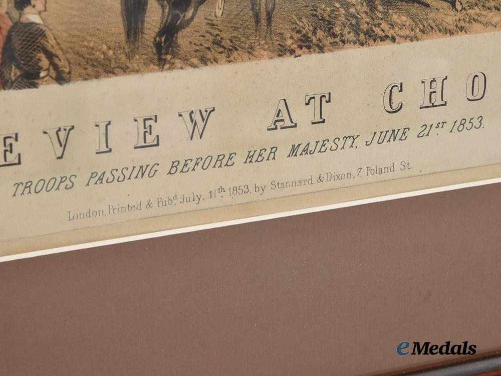 United Kingdom. A Period Coloured & Framed Lithograph of “The Review at Chobham - The Troops Passing Before Her Majesty”, by Augustus Butler