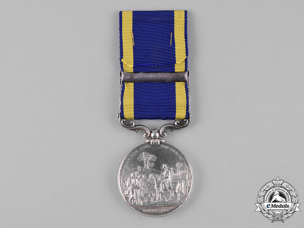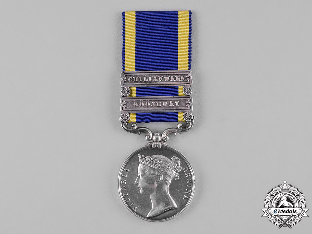 Footnote: The Punjab Medal was issued to officers and men of the British Army and Honourable East India Company who served in the Punjab campaign of 1848-49. The Chilianwala clasp was awarded to troops under the command of Lord Gough who engaged with the Sikh ary of Sher Singh and Lal Singh near Chilianwala. In total, 21,453 of these clasps were awarded (4,300 to Europeans and 16,153 to Indian troops). The Goojerat clasp was awarded to troops under the command of Lord Gough who defeated the Sikh army of Sher Singh at Gujarat. In total, 32,960 of these clasps were awarded (6,200 to Europeans and 26,760 to Indian troops).