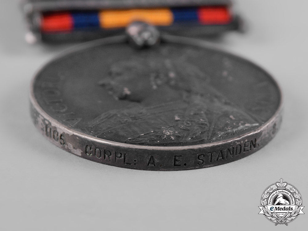 3 Clasps - CAPE COLONY, ORANGE FREE STATE, TRANSVAAL (1105 CORPL: A.E. STANDEN. S.A.C.). Naming is officially impressed. Very dark patina, edge nicks, very light contact, replacement ribbon, better than very fine.