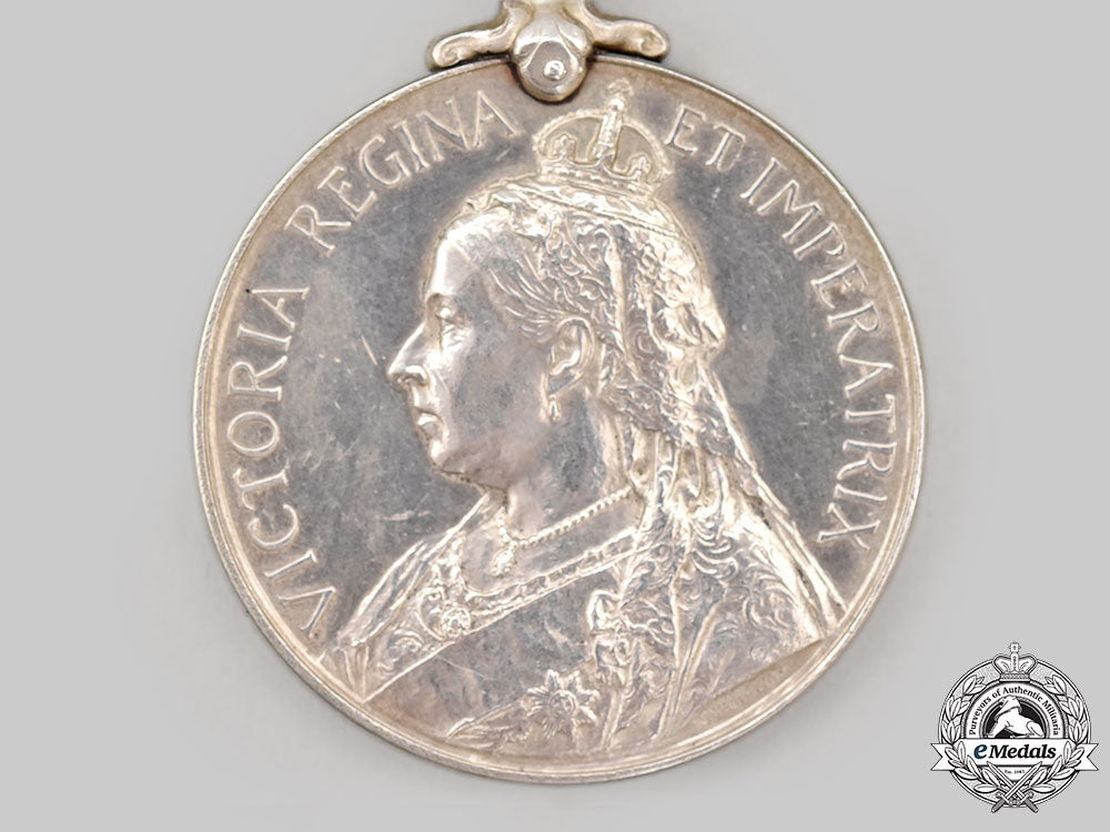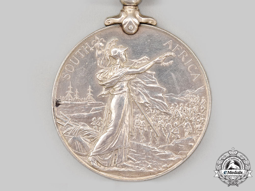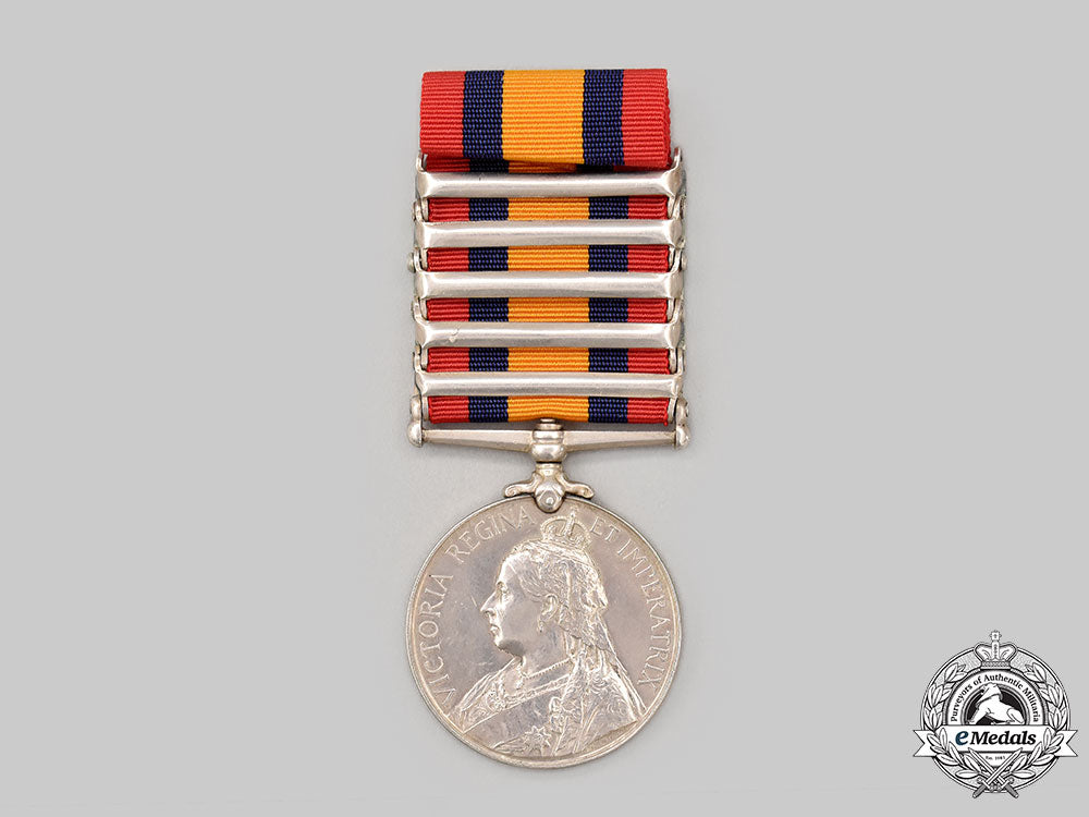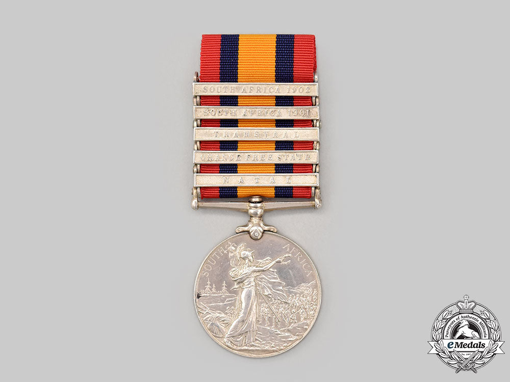 Instituted 1899 by Queen Victoria. A silver medal, obverse portraying the left facing Queen Victoria, the reverse features the figure of victory holding a laurel wreath with troops in the background, the rim is impressed 23396 PTE R. FORBES. 20TY COY IMP. YEO., worn on a straight bar swivel suspension attached to a replacement ribbon with five clasps: SOUTH AFRICA 1902, SOUTH AFRICA 1901, TRANSVAAL, ORANGE FREE STATE, NATAL, weighs 53.1 grams, polished for brightness, minimal wear, in extremely fine condition.