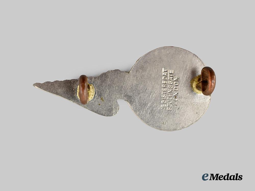 Constructed of silvered bronze, the obverse consisting of a black enameled medallion bearing a silvered Maltese Cross with its arms joined through the quadrants by lions passant, situated within a silvered ring bearing an inscription of “THE ST. JOHN AMBULANCE BRIGADE / AIR DUTIES DIV.”, flanked by a single wing, the reverse retaining both lugs and stamped with a St. John Ambulance registration mark, measuring 40 mm (w) x 20 mm (h), in extremely fine condition.