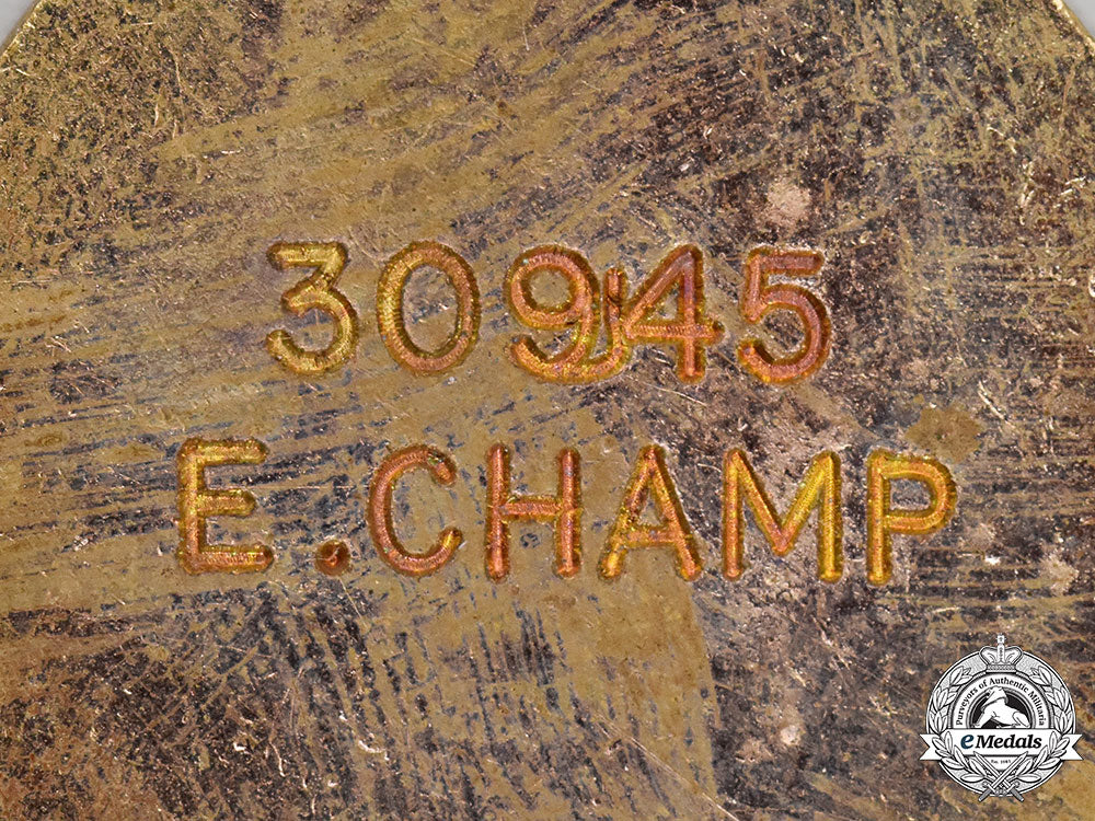 In bronze gilt with red and white enamels, recipient's name engraved "30945 E. CHAMP" on the reverse, measuring 39.3 mm (w) x 43 mm (h) inclusive of its integral ring suspension, exhibiting scuffing and contact marks on the reverse, original ribbon, suspended from a hanger inscribed "PROFICIENCY IN RED CROSS NURSING" with pinback, maker marked "J.R. GAUNT LONDON" and coded "Rd. No. 629266" on the reverse of the hanger, better than very fine.