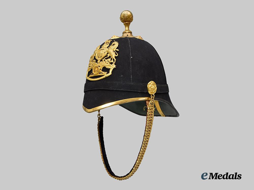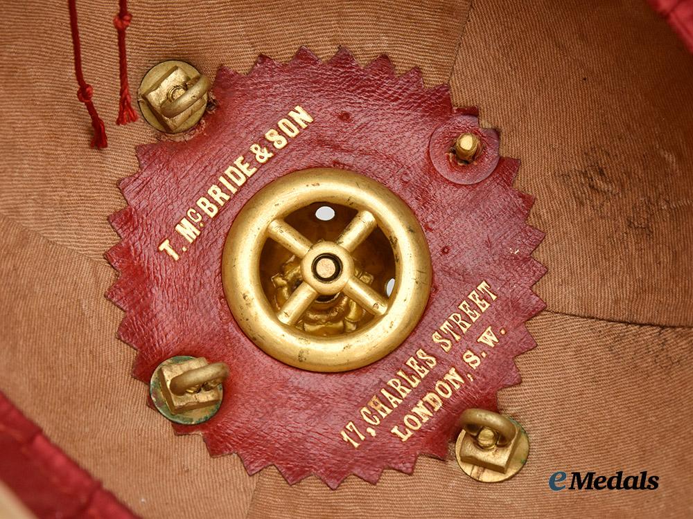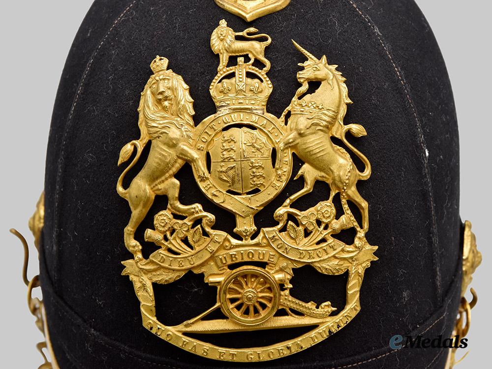 The helmet is constructed of a standard cork core with “blue” cloth covering the exterior of the body. The front is decorated with a King’s Crown Royal Artillery helmet plate constructed of gilded brass, in a convex shape to accommodate the outline of the helmet. The outer edge of the front of the helmet is decorated with a strip of gilded brass trim, with two rose side bosses with hooks on either side of the helmet, securing a chin strap made up of multiple interlooped rings forming a band with a felted underside for comfort during wear. The top of the helmet is ordained with a screw-on ball fitting with four petals at the base, all bearing a rose each. The reverse of the helmet features an additional hook with a straight line of gilded brass trim running down along the center of the helmet. The interior is lined with emerald green faux leather (leatherette), with an off-white leatherette sweat band, red trim, and an air vent hole at the top of the helmet that is secured to the top via four threaded nuts. It is marked “T. Mc. Bride & Son, 17 Charles Street, London, S. W.”. It measures approximately 163 mm (w) x 270 mm (l) x 225 mm (h), the helmet plate is secured to the helmet via three looped studs visible on the reverse, but missing the cotter pins and therefore slightly loose, in overall better than extremely fine condition.