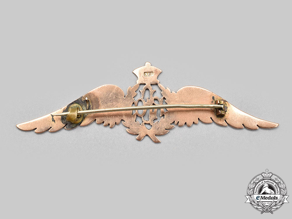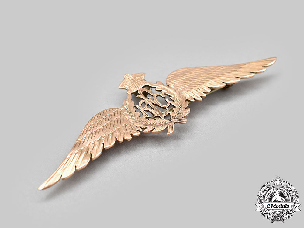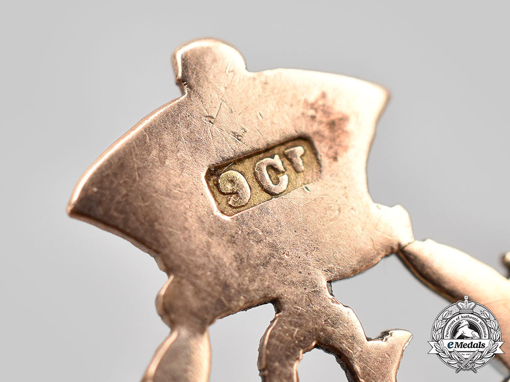 In 9 Kt Gold, weighing 6.1 grams, marked "9 Ct" (9 Kt Gold) on the reverse, intricately engraved and exhibiting terrific fine detail in the crown, insignia, wreath and wings, measuring 78 mm (w) x 24.7 mm (h), horizontal pinback, contact marks evident on the reverse, near extremely fine.