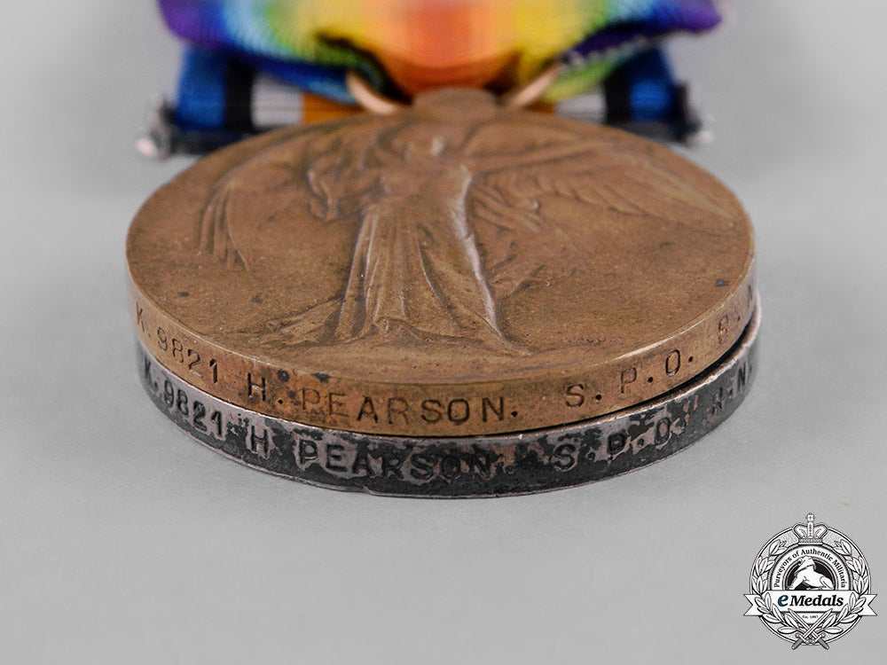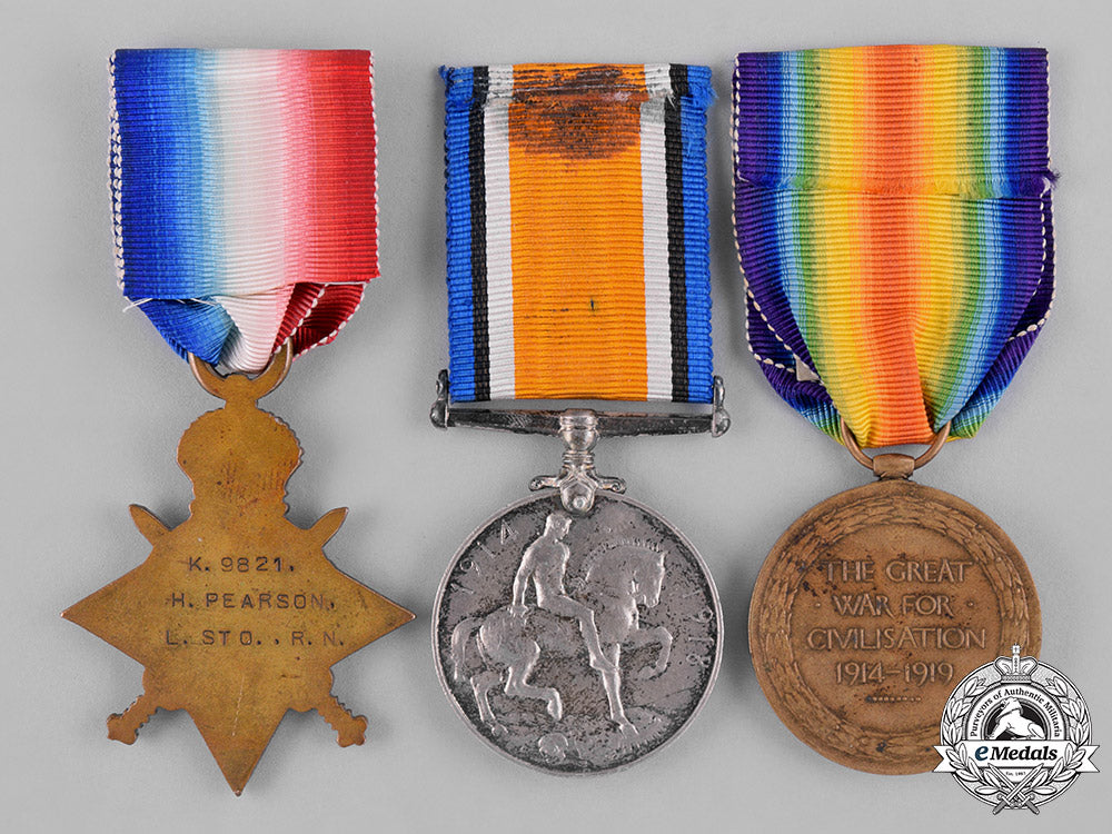 1914-15 Star (K. 9821, H. PEARSON, L. STO., R.N.); British War Medal (K. 9821 H. PEARSON. S.P.O. R.N.); and Victory Medal (K. 9821 H. PEARSON. S.P.O. R.N.). Naming is officially impressed. Un-mounted, very dark patina on the obverse and edge of the BWM, bruising on the VM, contact marks, replacement ribbons, fine.