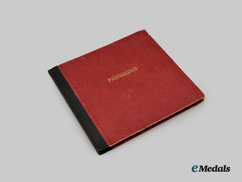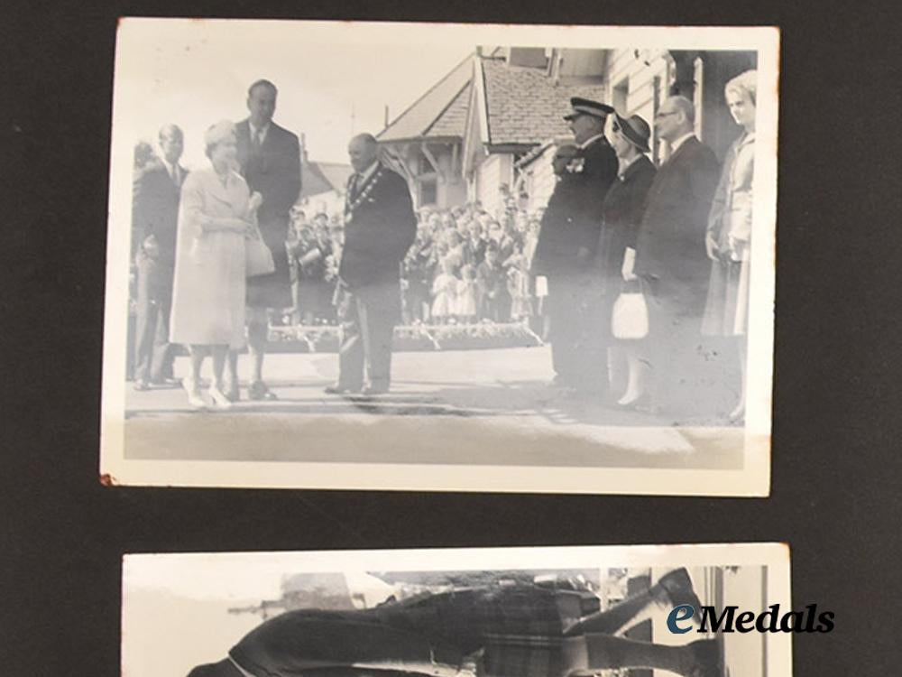 A Royal photograph album formerly belonging to The Queen’s head Chauffeur, Mr. William Leslie Chivers R.V.M, containing photographs of the Royal Family touring Scotland. The front and rear covers of the album are constructed of a stiff cardstock core with a red textured faux leather (leatherette) exterior, the cover embossed with “Photographs” in gilt. It contains ten double-sided pages filled with up to five annotated black-and-white photographs per page, depicting Queen Elizabeth, The Queen Mother, Prince Phillip, and Prince (His Majesty the King) Charles laughing, chatting, and visiting several formal gatherings in the countryside of Scotland. The photo album measures 25 mm (w) x 235 mm (l), and is extremely well preserved.