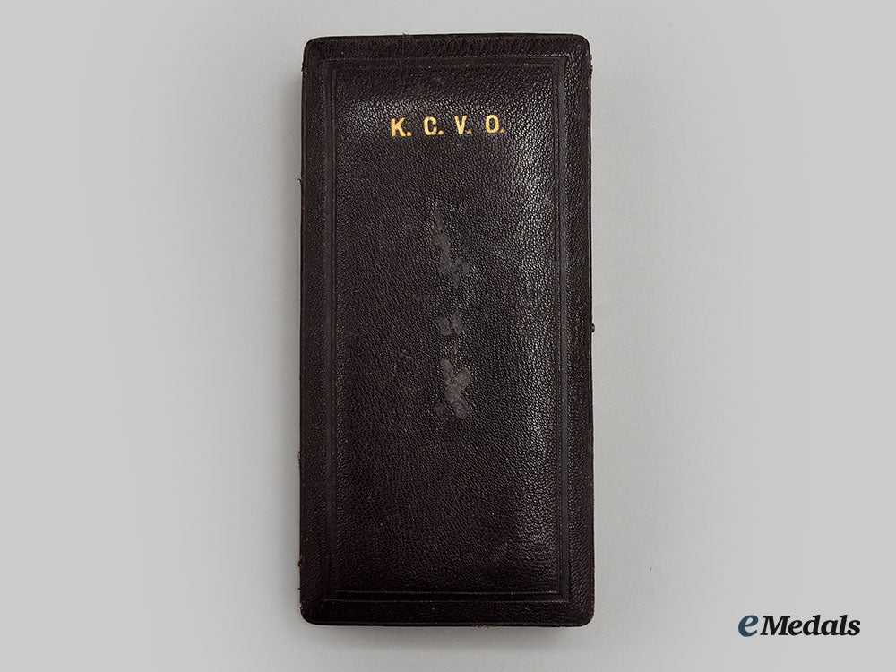 Contained in its original case of issue, black leatherette exterior marked K.C.V.O, the interior with a crème-coloured silk interior marked COLLINGWOOD & Co. LONDON, with a green velvet recessed medal bed, compartment below for neck ribbon, with card of statutes of wear, measures 112mm (w) x 125mm (l) x 30mm (d), residue and wear to exterior, Kanji written in pink ink on interior lid, silk split over the hinge, hinge and catch functional, in very fine condition.