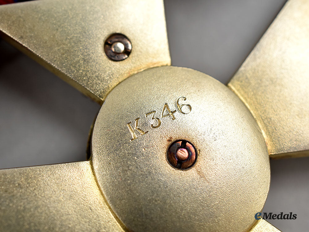 Instituted April 21, 1896. A Knight Commander Set, comprising the neck badge in silver gilt, featuring a white enamelled Maltese cross, the obverse medallion presenting the cypher VRI on red enamel, surrounded by a blue enamel ring inscribed VICTORIA, with a crown above the medallion on the 12 o’clock arm, the reverse is plain, engraved K346, measures 51.45mm (w) x 54.85mm (h – inclusive of rings), weighs 44.2 grams (including ribbon), worn on a full length neck ribbon, enamels intact, in extremely fine condition. The star of the order, in silver, featuring a Maltese cross with faceted rays, and smaller faceted rays in each quadrant, the medallion with the cypher VRI on red enamel, surrounded by a blue enamel ring inscribed VICTORIA, with a crown above the medallion on the 12 o’clock arm, the reverse offers a Gold vertical pin, center engraved 346, measures 73.81mm (w) x 72.43mm (h), weighs 62.5 grams, enamels intact, lovely patina, in extremely fine condition.