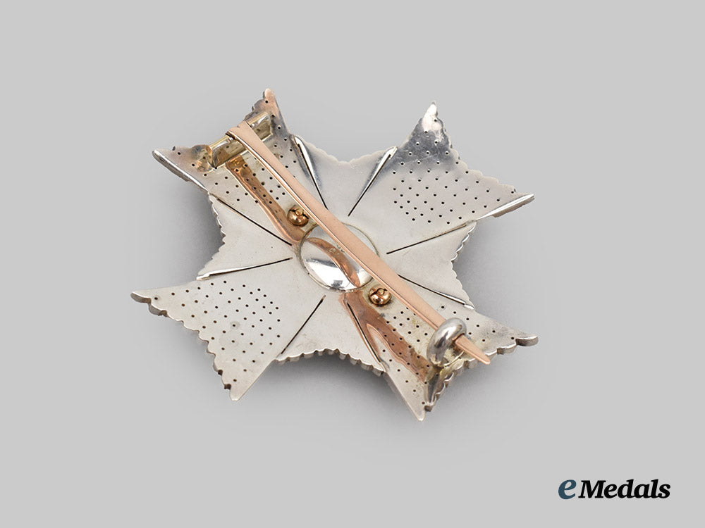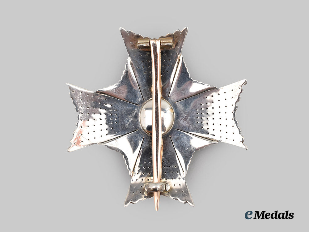 Multi-piece construction, insignia in silver gilt with red, blue and green enamels and fronting a silver cross base, affixed to a silver cross base via two Gold rivets, each of the four arms of the cross with nine faceted rays, with nine smaller faceted rays between each arm, number stamped "25" on the cartouche, measuring 73.5 mm (w) x 73.5 mm (h), Gold vertical pinback, intact enamels, extremely fine.