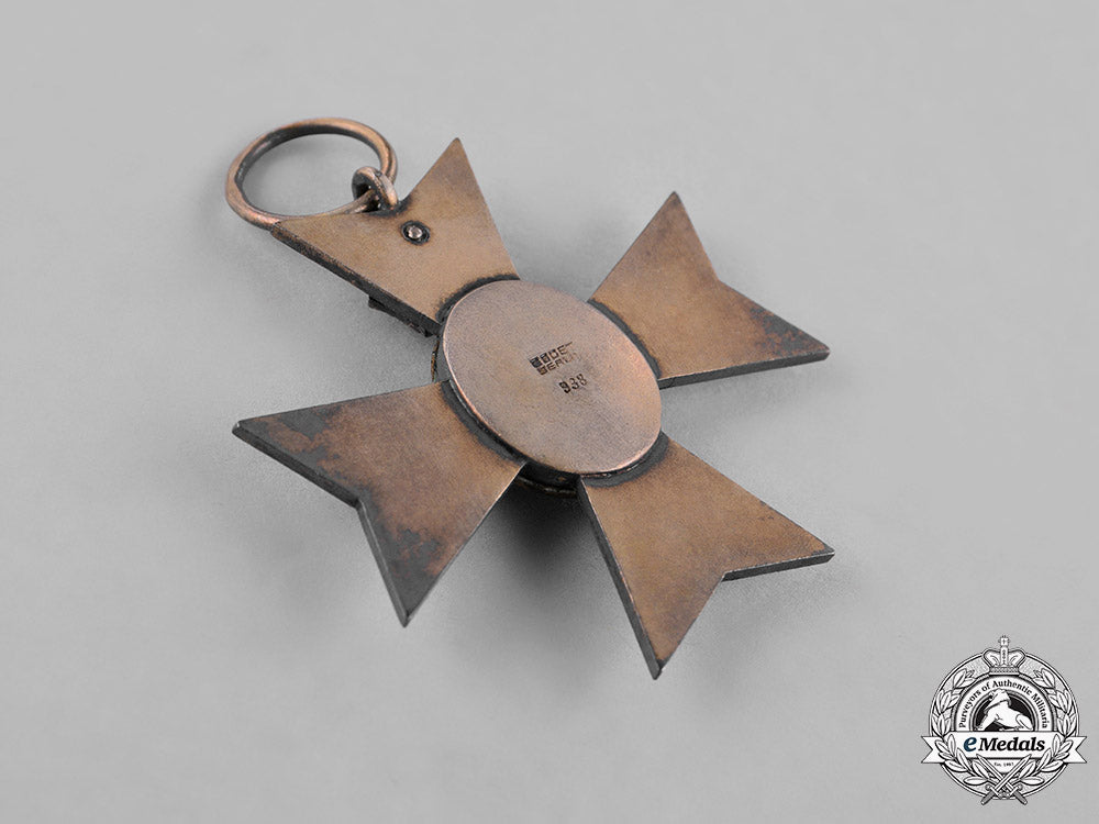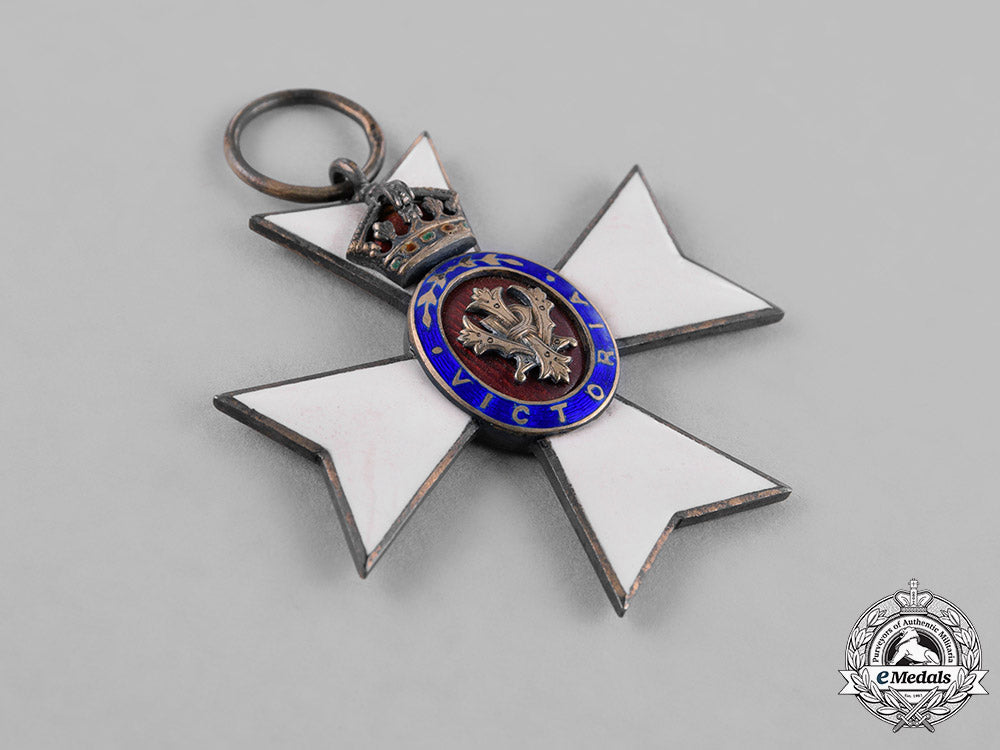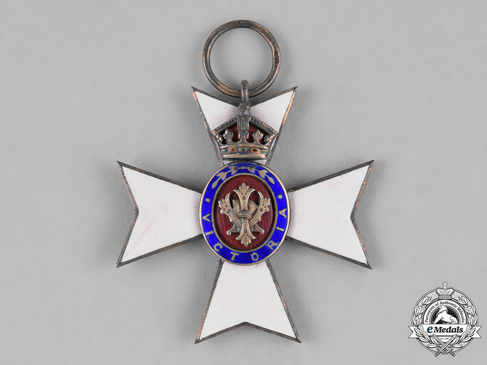 Instituted 1896. A silver Maltese cross with white enameling, obverse centre presenting a silver gilt cypher of Queen Victoria on a red enameled field, with blue enameled surround with VICTORIA and a pair of laurel branches, 12 o'clock arm adorned by a finely detailed silver gilt and enameled crown, reverse marked "938" (silver) and maker marked "GODET-WERNER BERLIN", measuring 45 mm (w) x 45 mm (h), on period ribbon, very fine.