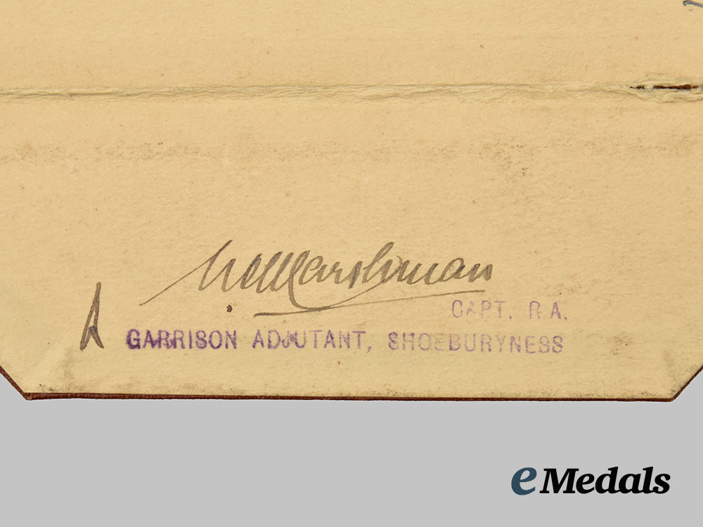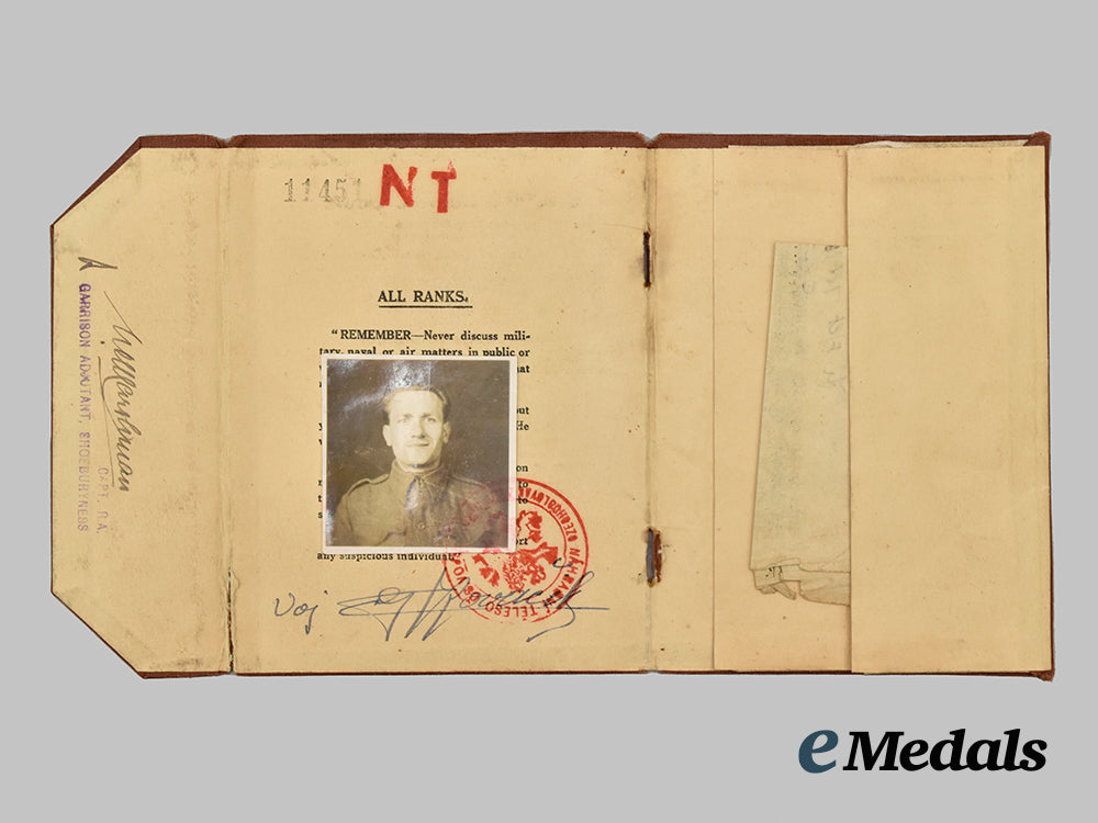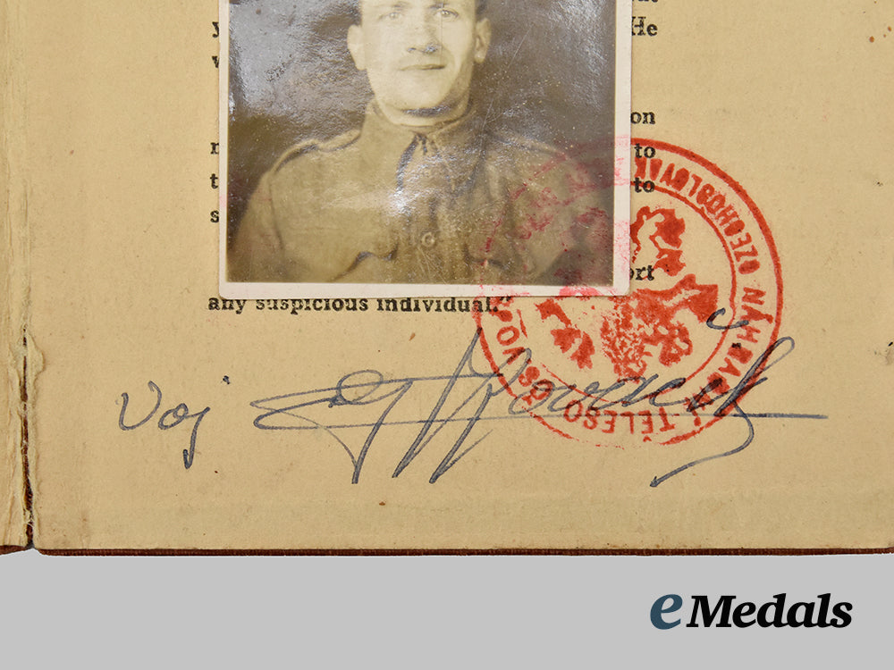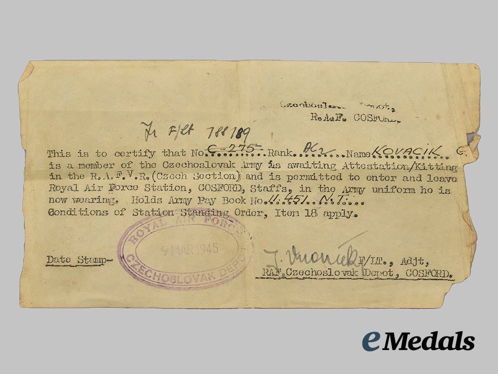 Constructed of a card stock binding with a faux brown canvas exterior liner, the cover bearing inscriptions of “ARMY BOOK 64” and “SOLDIER’S SERVICE AND PAY BOOK”, the interior retaining a black-and-white studio photo of Aircraftman 2nd Class (AC2) Kovacik, certified by a Czechoslovakian Army stamp with signatures, accompanied by a small paper pass featuring a typewritten inscription indicating that Kovacik was serving with the Czechoslovakian Army and assigned to the Royal Air Force Volunteer Reserve (R.A.F.V.R.) and is awaiting kitting while also permitted to enter and leave R.A.F. Cosford (Shropshire), dated 9 March 1945 and certified by the handwritten signature of Flight Lieutenant Jindřich Vnouček, Adjutant to the Czechoslovak Depot at Cosford, the booklet measuring 10 cm (w) x 13 cm (h), demonstrating moderate material fatigue, and interesting identification booklet to a serviceman with the Czechoslovakian Army in exile in very fine condition