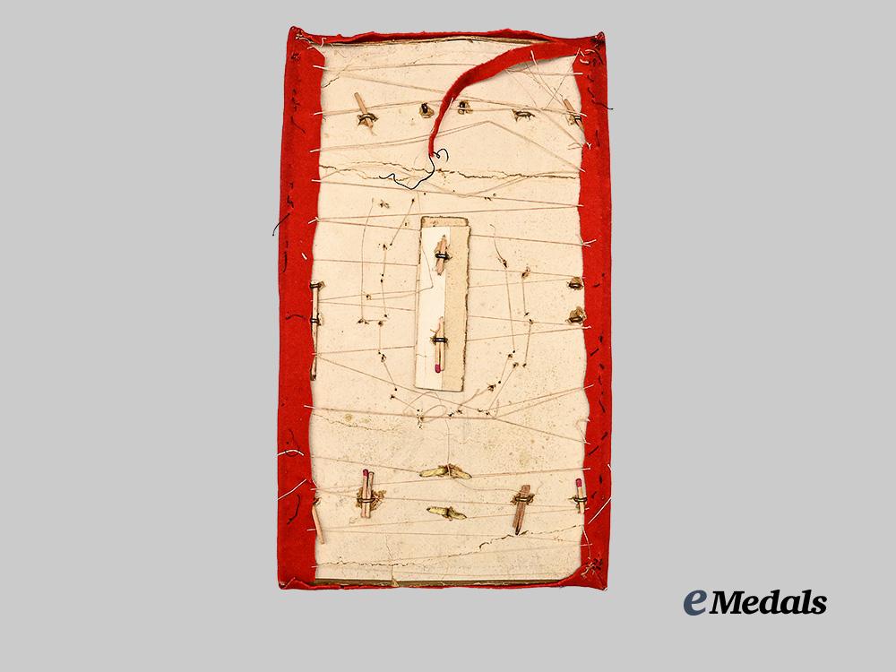 A set of Royal Fusiliers Insignia on a red felt display board, containing a large helmet plate encircled by a helmet chin chain, two cap badges, two collar badges, four large and four small buttons, prongs on the reverse, measures 183 mm (w) x 313 mm (l), reverse has been sewn closed on demonstrating multiple lugs with matchsticks to secure them, chain loose and will partially spill off the board, all very fine.