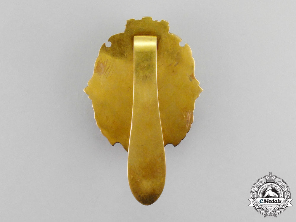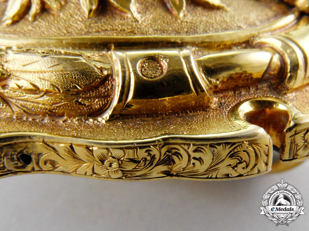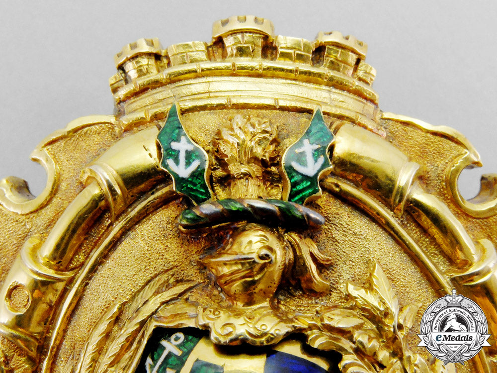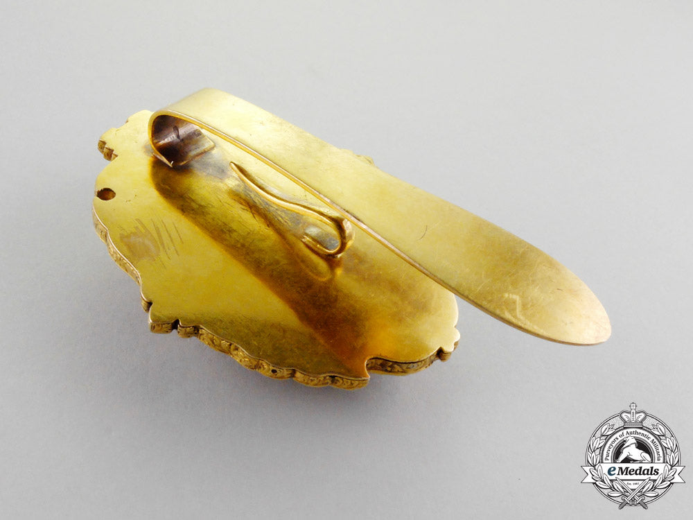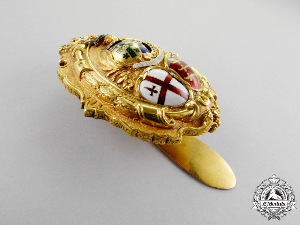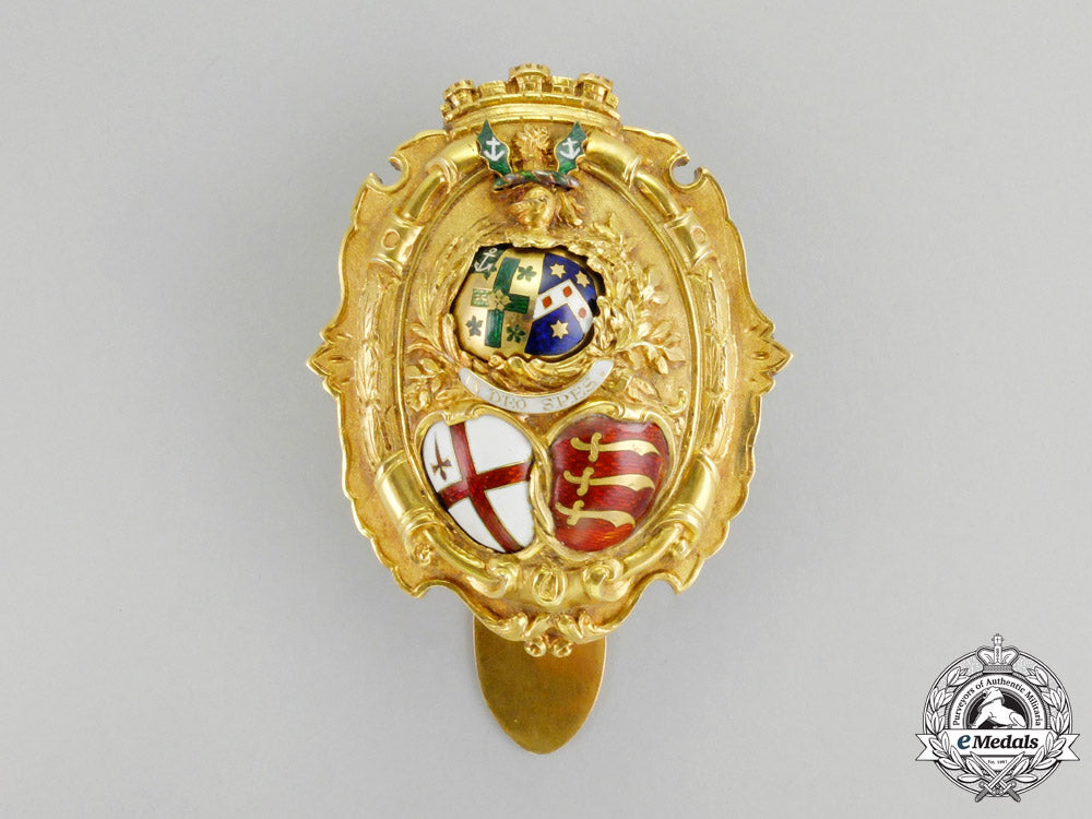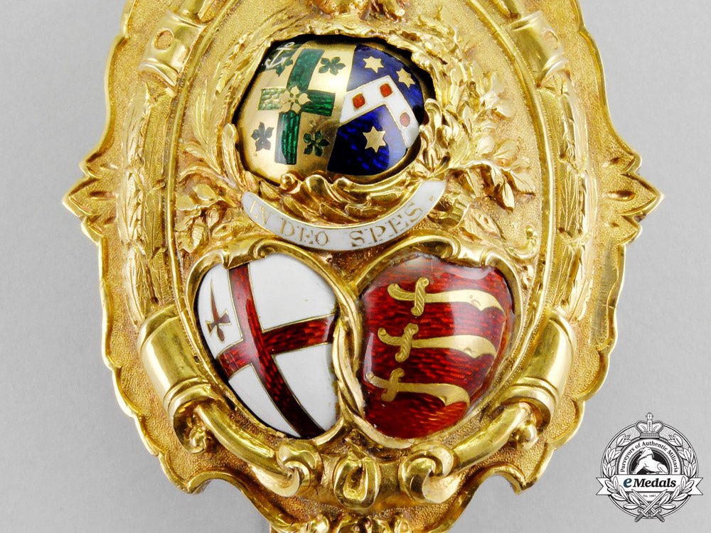 An absolutely outstanding badge finely crafted in 22k gold,with highly ornate hand etched detailings, proudly presenting the coat-of-arms of the City of London, the County of Middlesex, both with finely detailed white and red enamels, with white enameled banner inscribed in Latin "IN DEO SPES" (Faith in God), centre with the family crest of the Sheriff of London George Edmund Hodgkinson as well as his wife Ellen Hopkinson, each in enamels with gold details, of hollow construction with the elaborate obverse mounted to a 14k backplate by 10 pins, edge of badge hand etched, reverse with single stay behind large prominent slider, measuring 59 mm (w) x 71 mm (h), 68.8 grams, with only very minor enamel loss to family coat of arms, 2 side pins loose inside badge, nonetheless, a badge of superior quality that is difficult to compare. Highly aesthetically appealing and extremely fine. Rare.