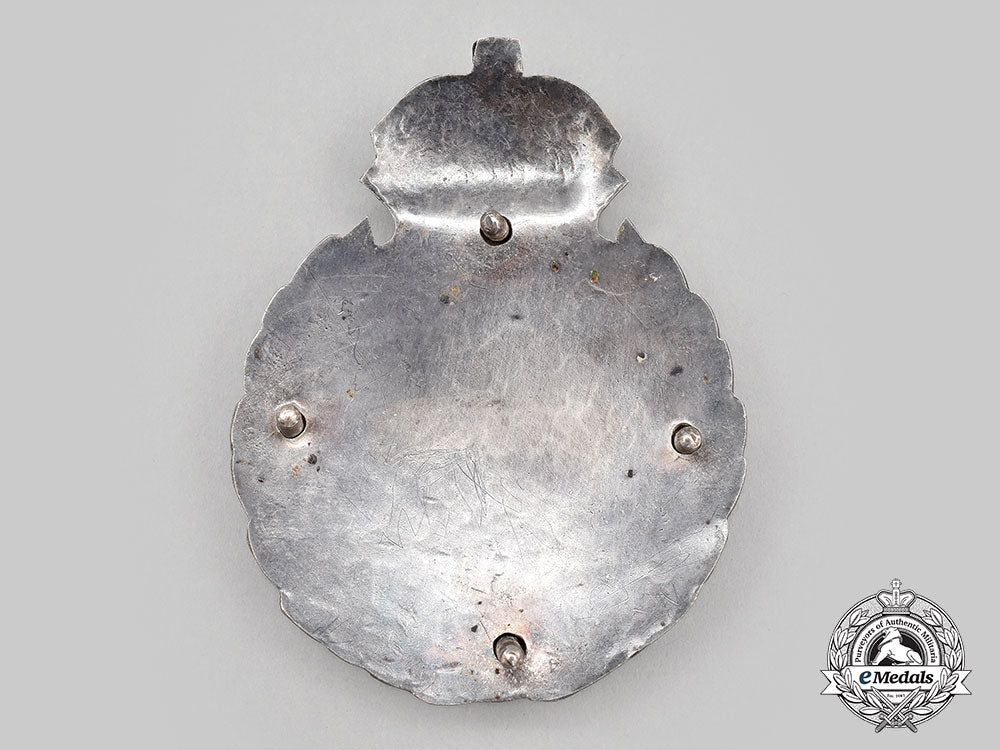 In silver, voided, unmarked, measuring 71.8 mm (w) x 93.5 mm (h), all four screwposts intact, very light contact, the support plate exhibiting ghosting from the voided areas of the badge on the obverse, near extremely fine.