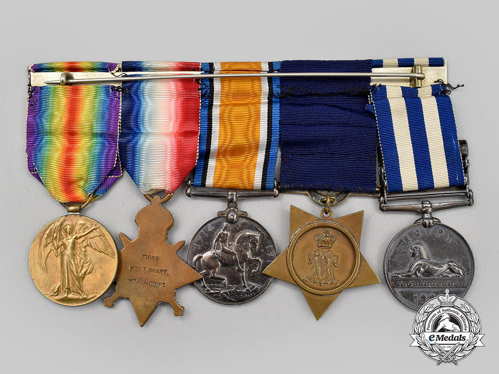 Thomas John Smart was born November 10 1857 in Paisley, Scotland. T. Smart joined the Royal Navy in 1875 and served until December 1884. During this time, he served in Egypt, earning the Egypt Medal with Tel-El-Kebir clasp and Alexandria 11th July clasp, while board the H.MS. Penelope in 1882. Prior to the First War, he immigrated to Winnipeg, Manitoba with his wife, Annie and sons. He enlisted on October 24, 1914 at the age of 56 with the 27th battalion. The unit sailed on May 17 1915 for Cologne. On March 21, 1916, he was promoted to Sergeant in the field. Smart was mentioned in dispatches in 1918. After 3 years and 3 months of service, Smart was returned to England and was later discharged due to demobilization on October 24, 1919. In 1921, he resided in Rosser, Manitoba with his wife and surviving son. Smart died on July 29, 1950 of a heart attack at a hospital in Winnipeg, leaving his possession to his son, Henry.