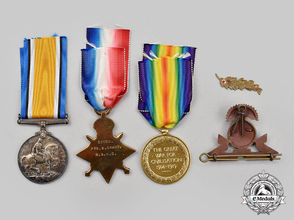 5. Victory Medal, bronze gilt, full size, rim impressed 71483 SJT. T. SMART. 27-CAN.INF., worn backwards on medal bar on original ribbon, light wear, in very fine condition. The medal bar measures 170mm (w) x 110mm (h – top to end of 14-15 star), weighs 199.7 grams, horizontal pin on reverse, in overall very fine condition. Accompanied by one palm leaf denoting MID.