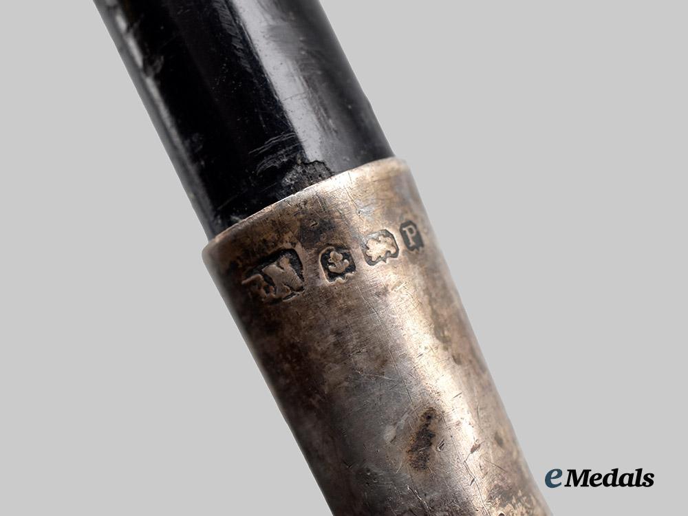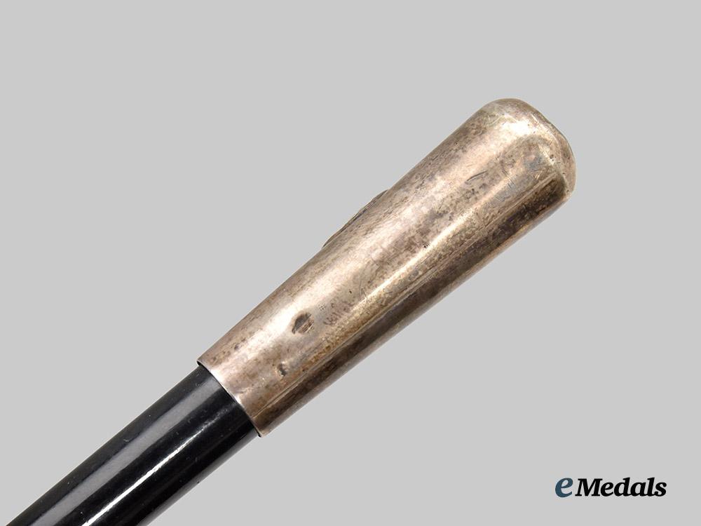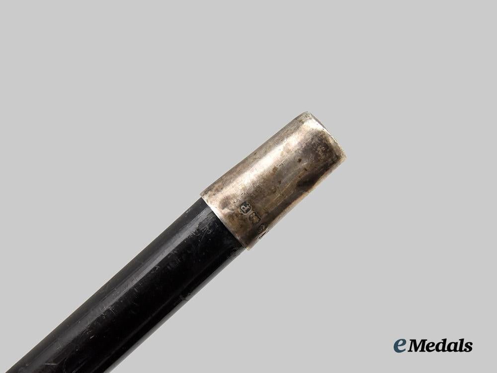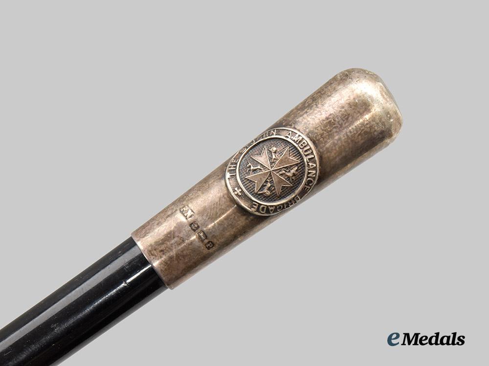 1. A St. John Ambulance Brigade swagger stick, constructed of a black lacquered shaft with silver fittings affixed to both the tip and base, the former bearing a raised St. John Ambulance Brigade insignia, situated above hallmarks indicating production in the city of Birmingham in 1939, with a content mark for 925 purity, measuring 75.5 cm in total length, demonstrating minor scratching, in near extremely fine condition.